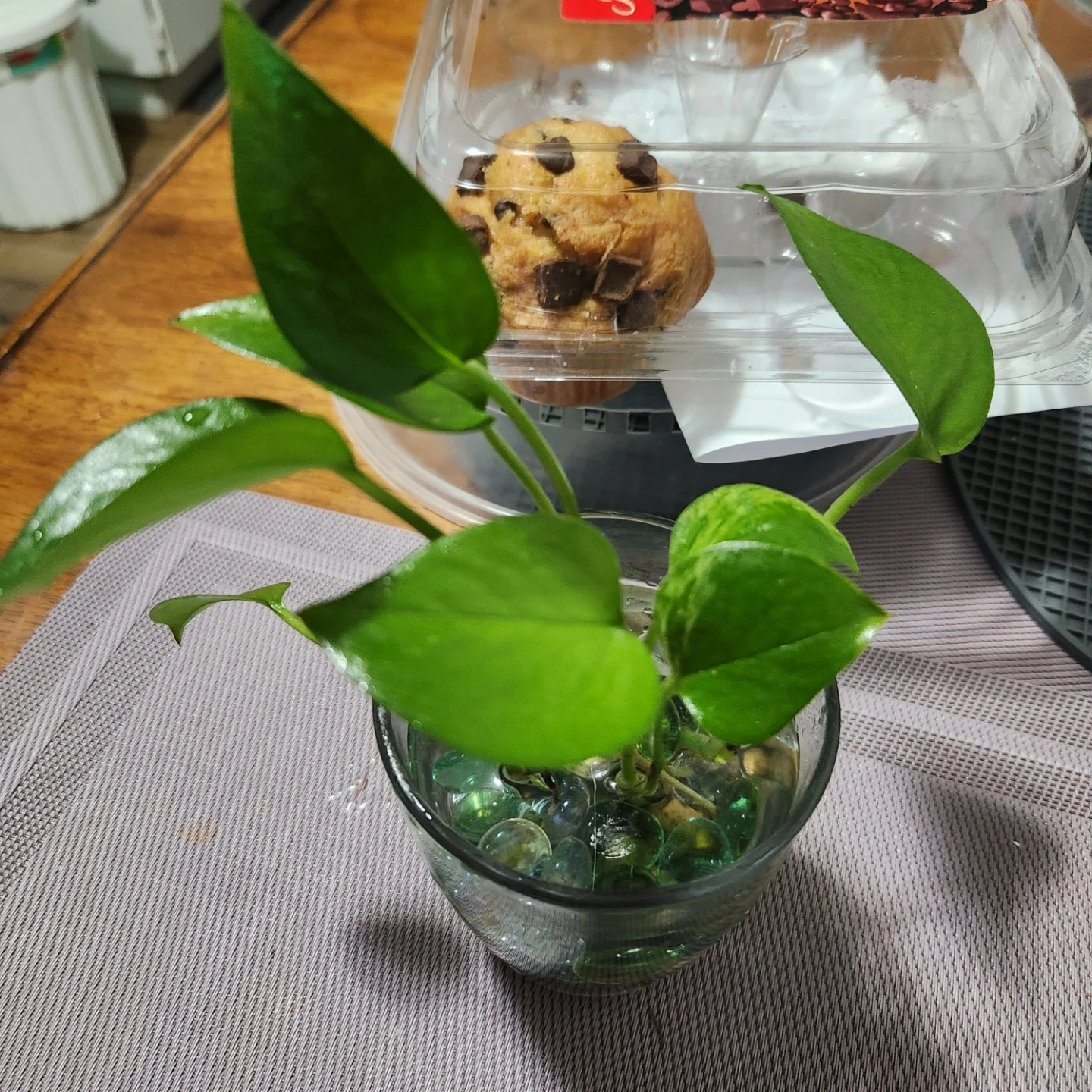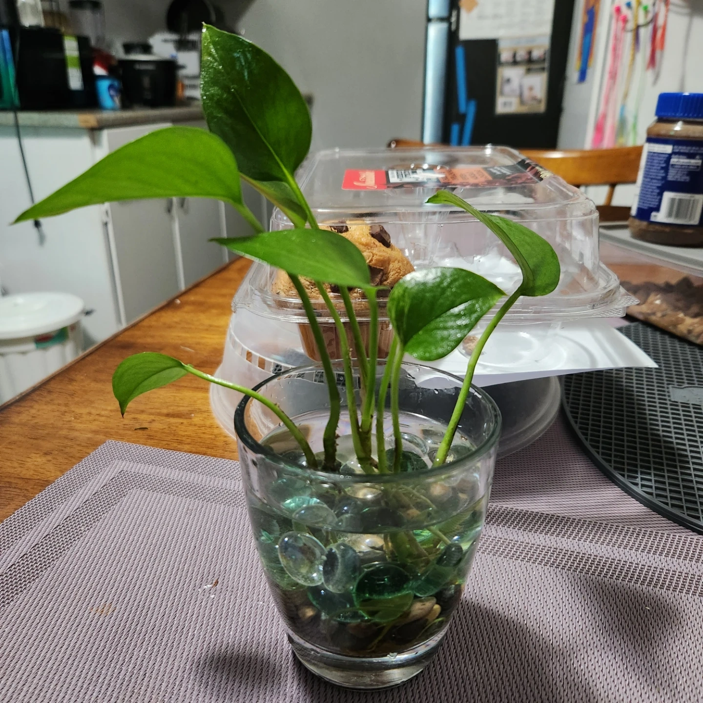 Pothos plant cutting rooted in a clear glass vase with decorative marbles. It's a vibrant green houseplant that's easy to care for. Perfect for adding a touch of nature to your space.