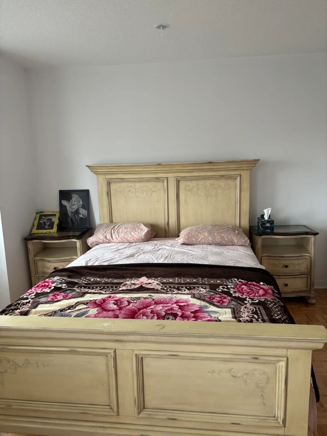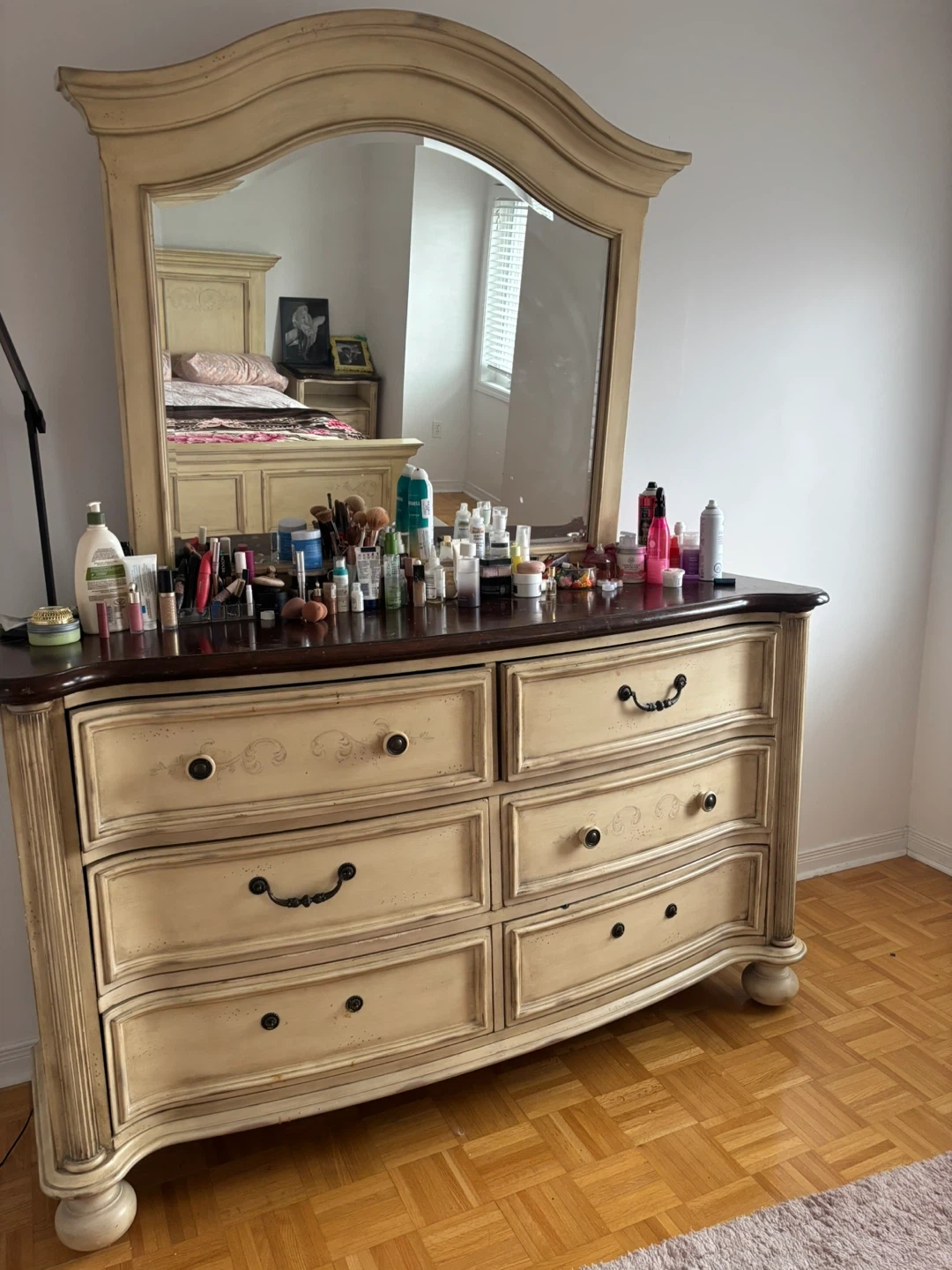 Cream coloured bedroom set with dresser and nightstands