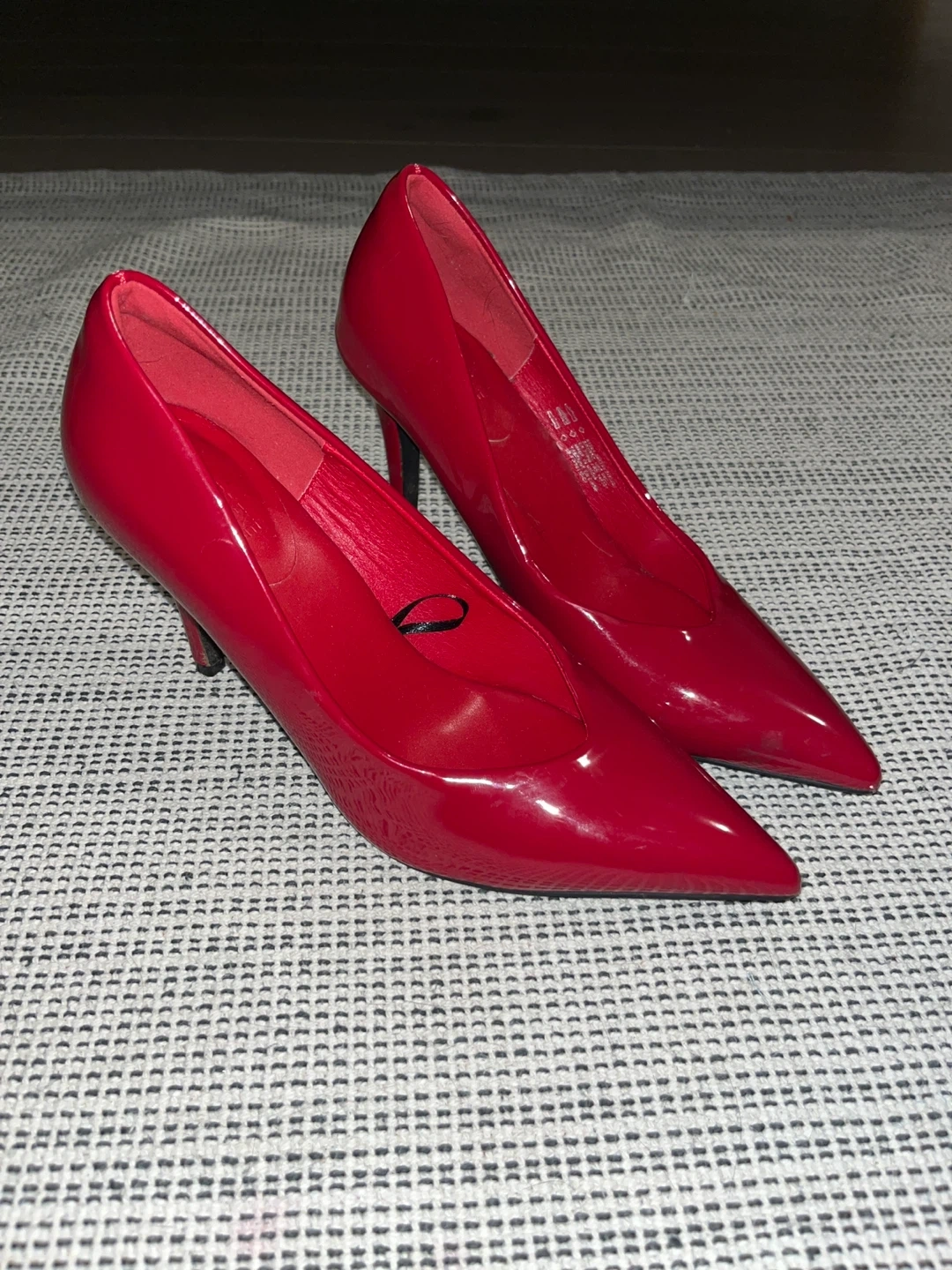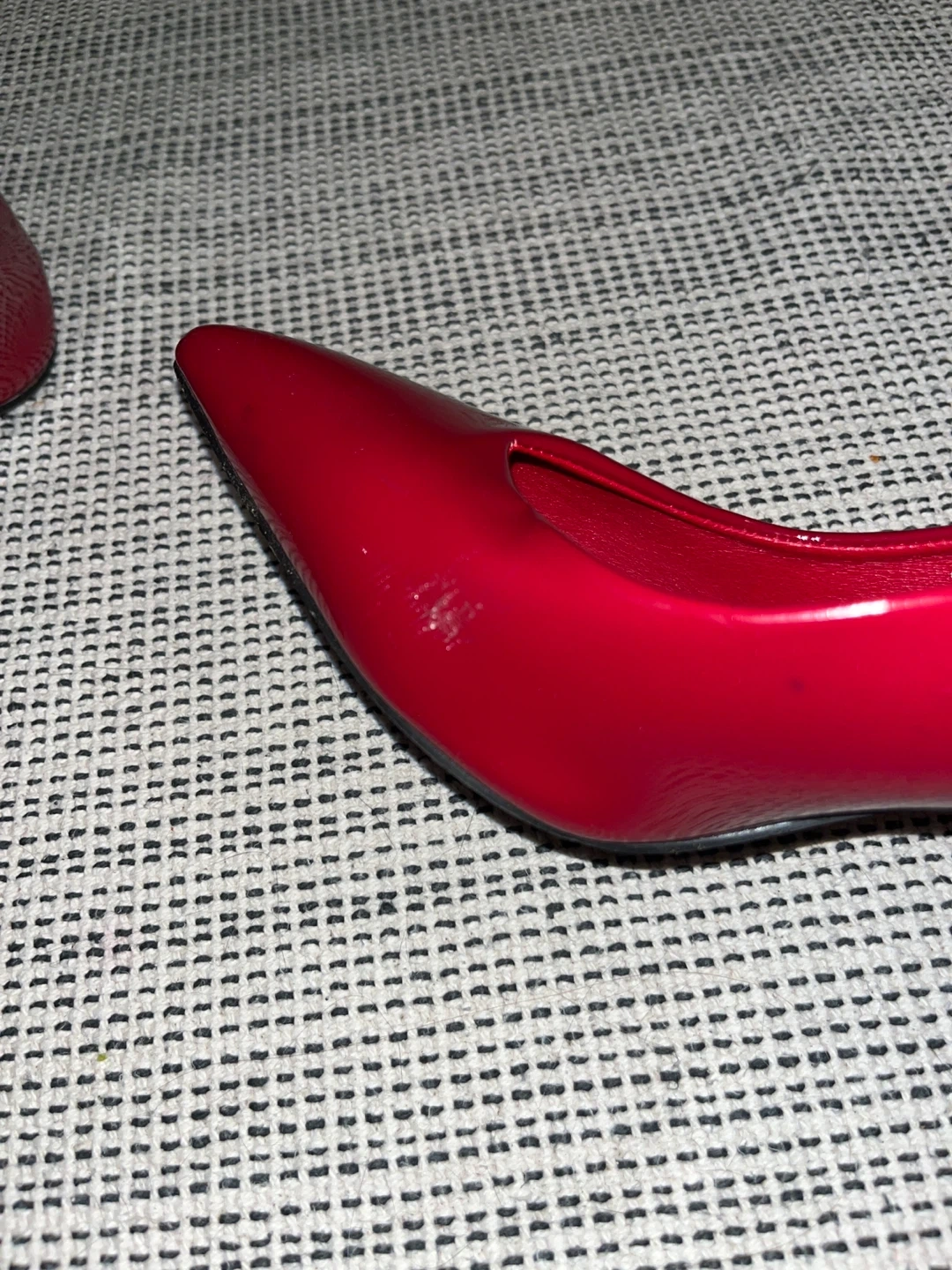 These are a pair of red patent stiletto pumps. They have a pointed toe and a slim heel. These shoes would be suitable for dressing up an outfit. Have a little scratch on the right heel. Was bought for 50% and worn for one night , size ended up being too big.
