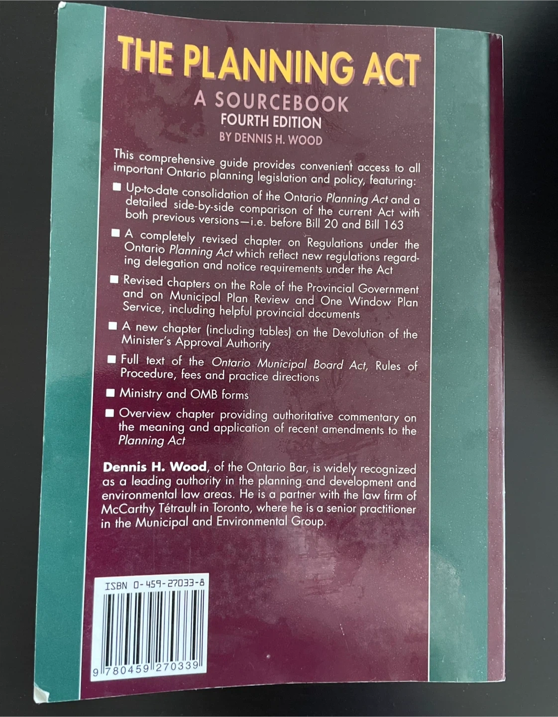 Very rare book. The Planning Act By: Dennis H Wood. Fourth Edition, published by the Canadian Bar Association. Large Book.