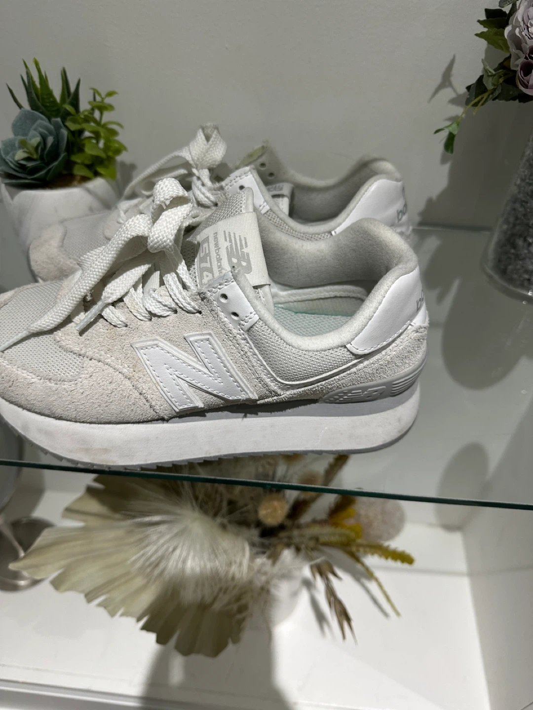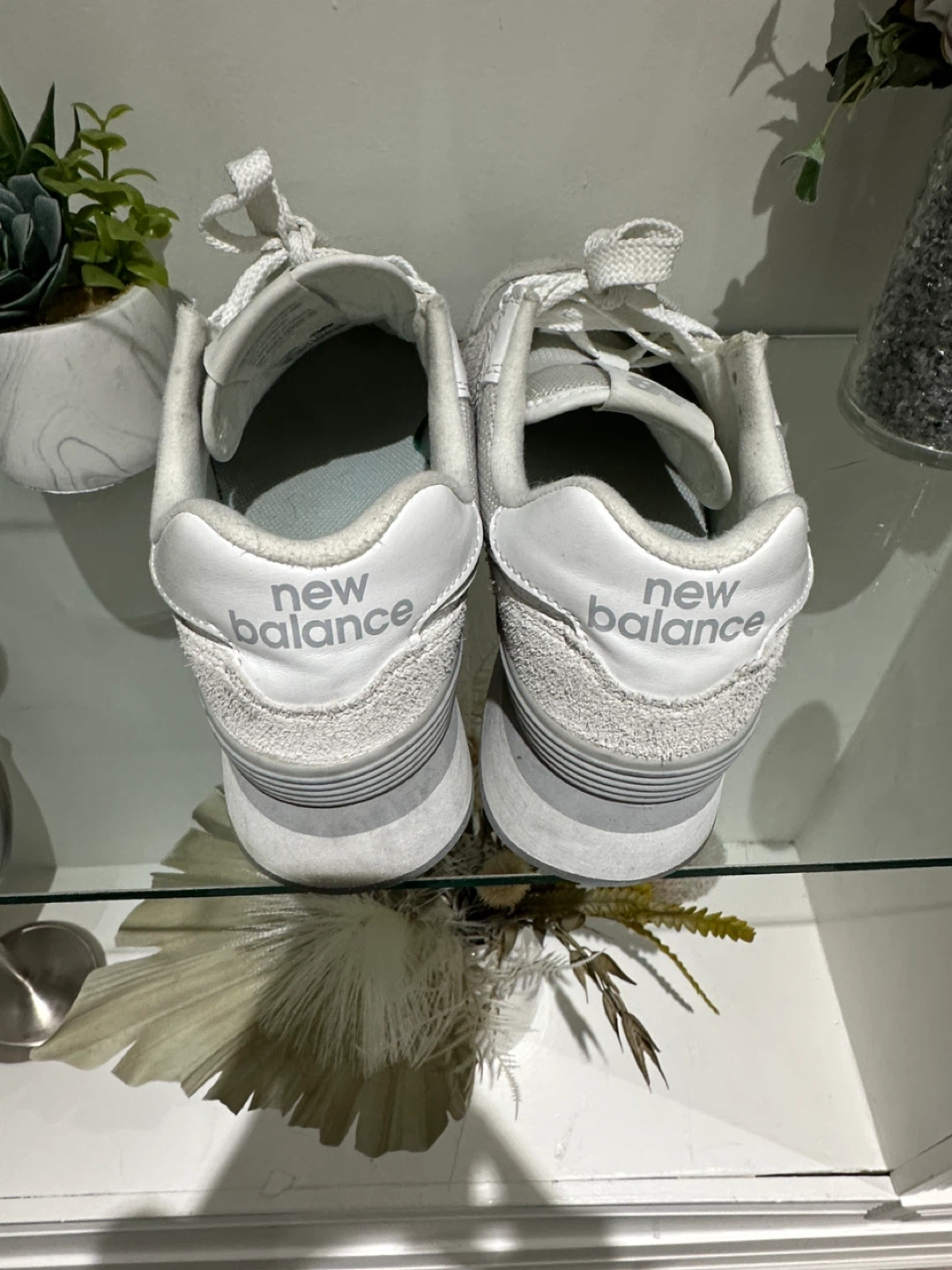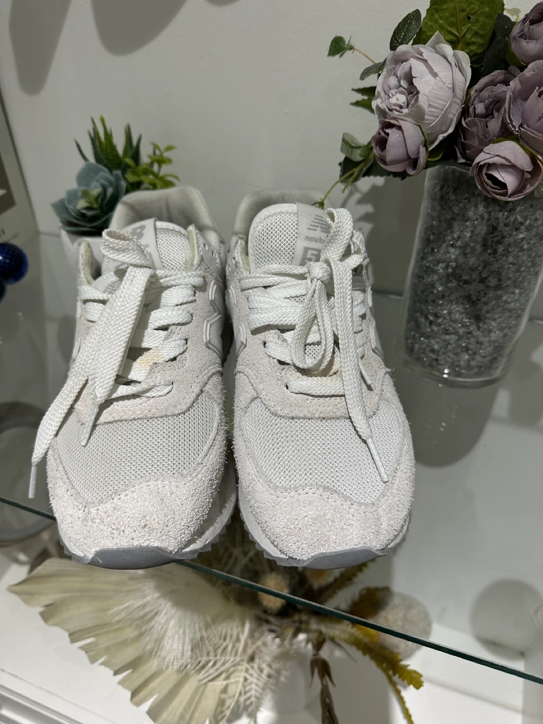 These are white New Balance 574 sneakers. They're made with a mix of suede and mesh materials. These shoes offer a classic look and comfortable fit.