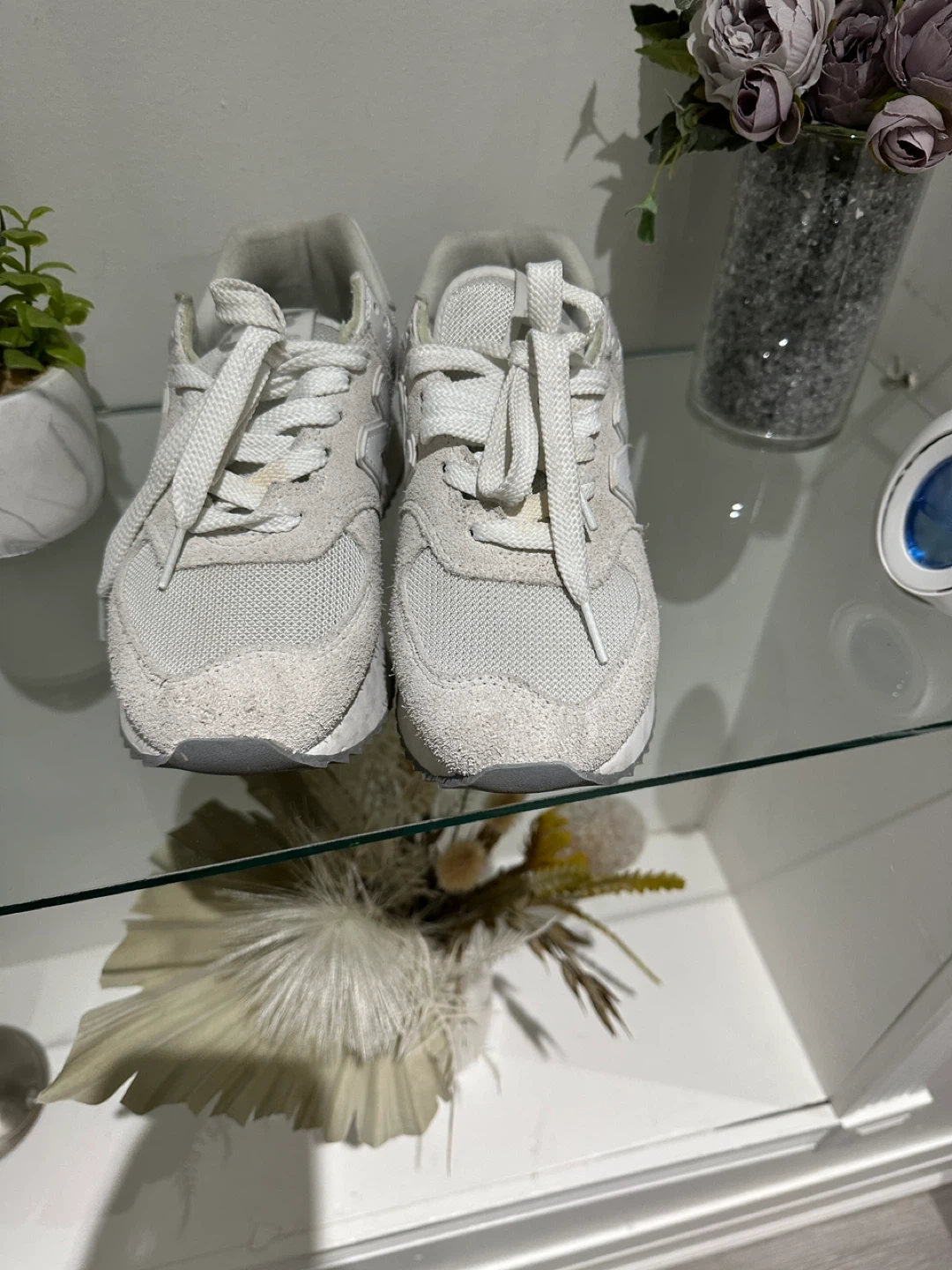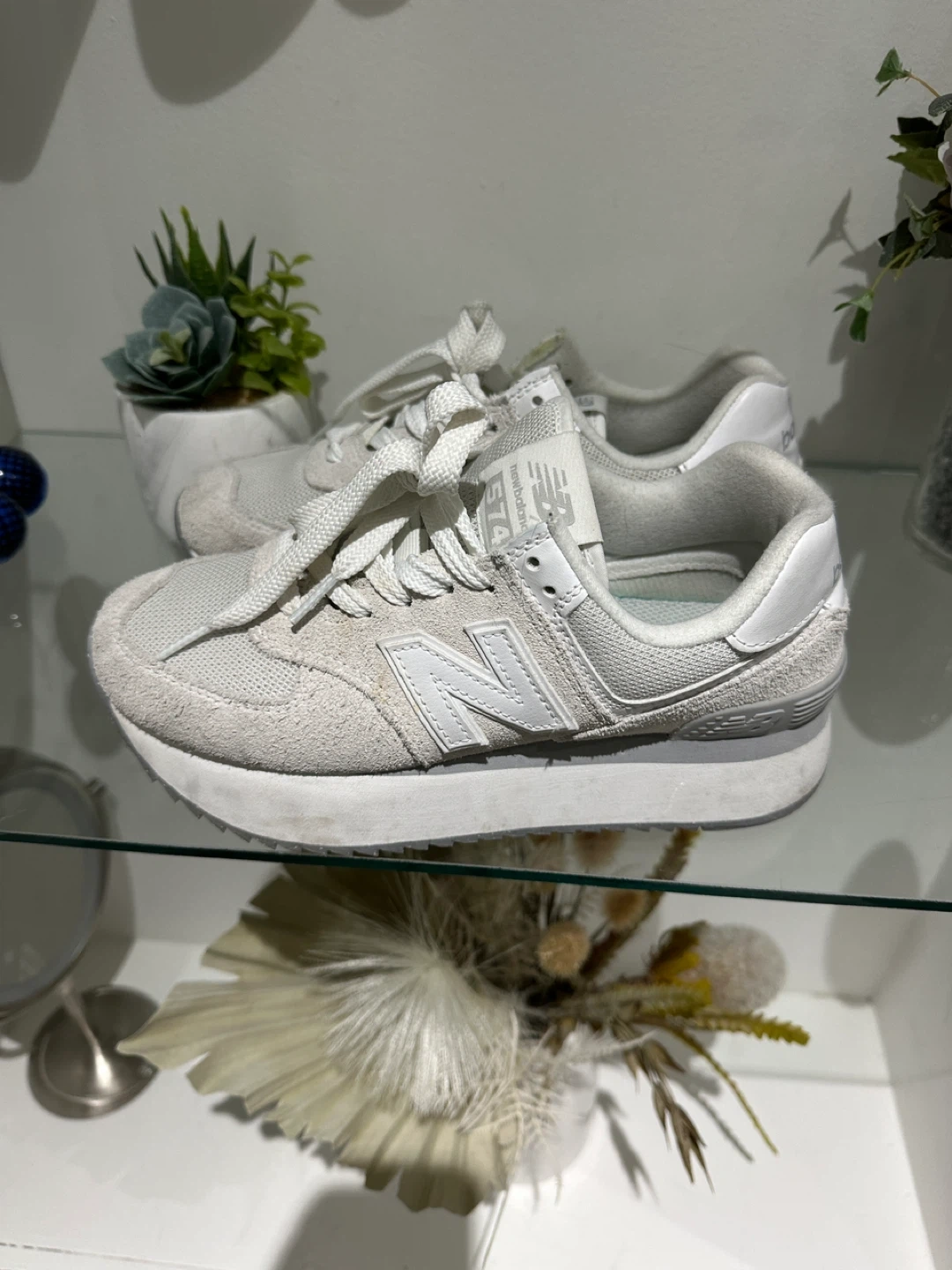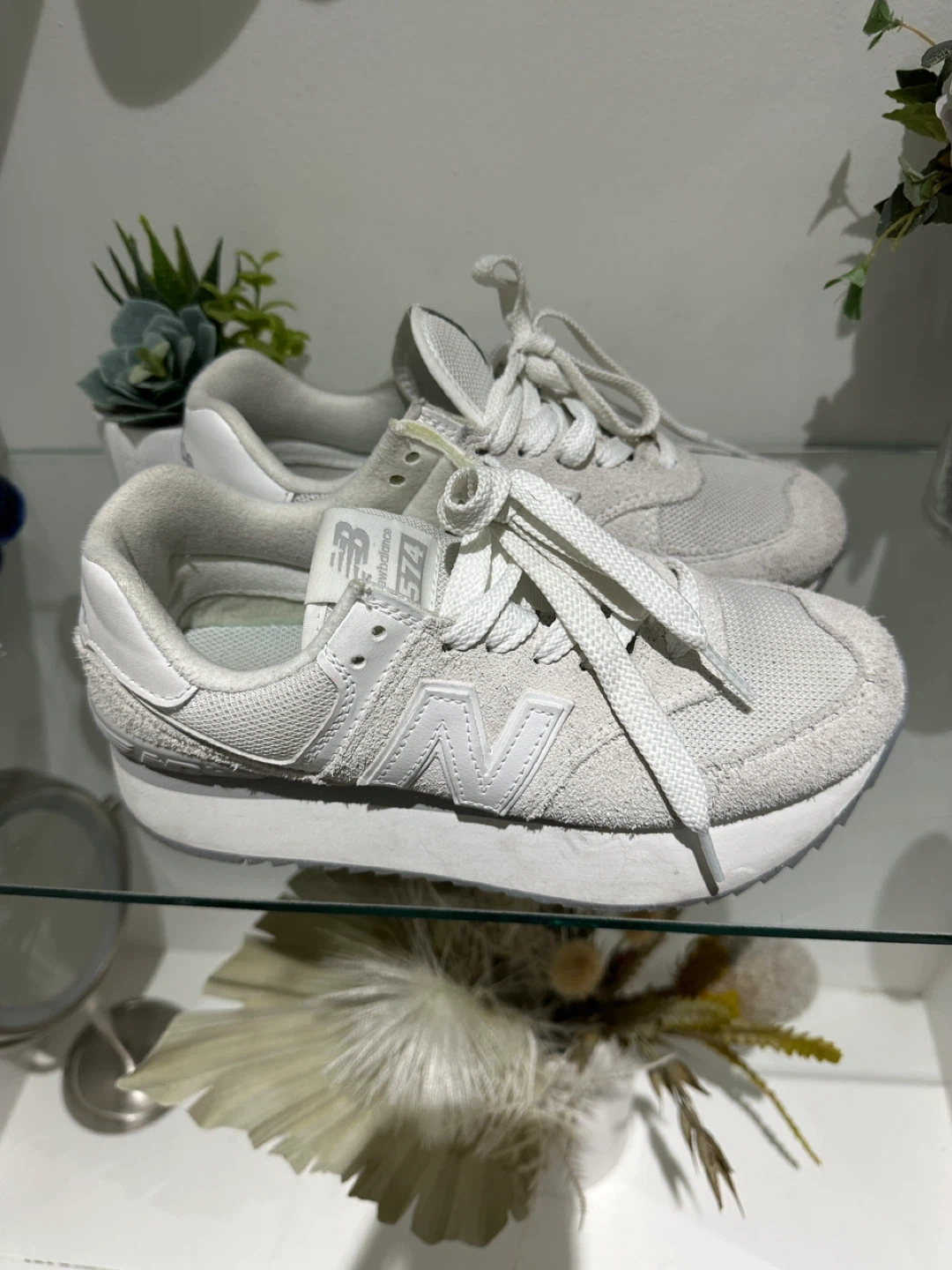These are white New Balance 574 sneakers. They're made with a mix of suede and mesh materials. These shoes offer a classic look and comfortable fit.