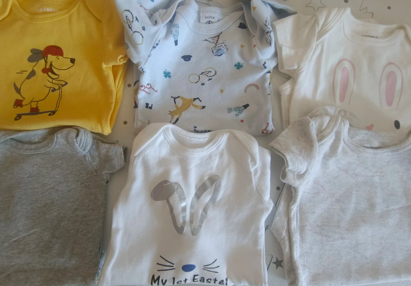 Includes a yellow short-sleeve bodysuit with a dog graphic, a white long-sleeve bodysuit that says 'My 1st Easter', a patterned long-sleeve bodysuit with foxes and plants, and a grey long-sleeve bodysuit with a whale pattern. Cotton material. Four 0-3 months and two 0-6 months
