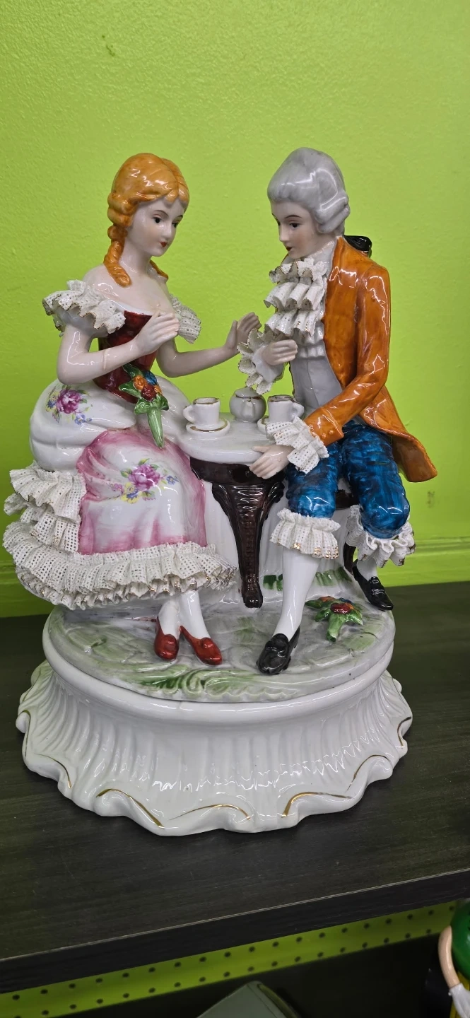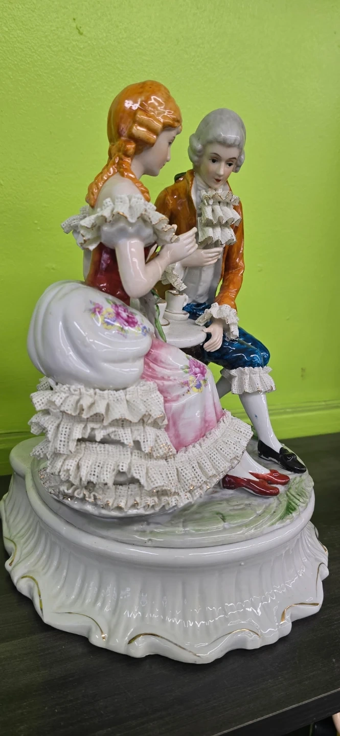 Beautiful vintage porcelain figurine featuring a Victorian-style couple enjoying tea together ☕💐