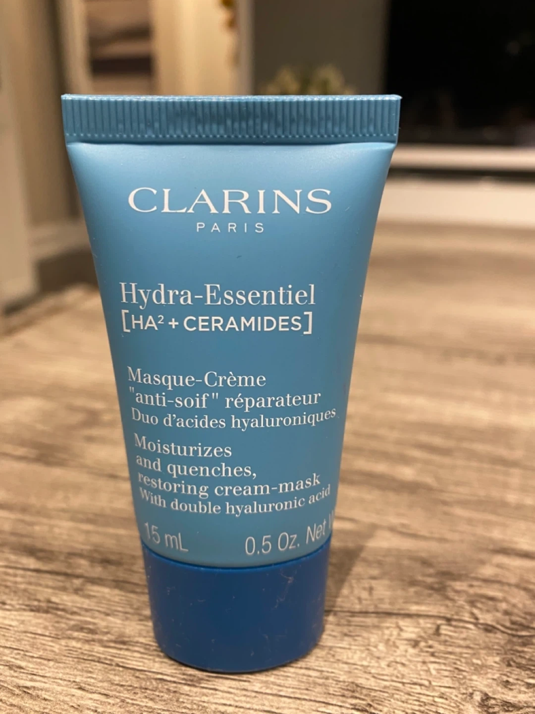 Clarins Hydra-Essentiel restoring cream-mask. It moisturizes and quenches with double hyaluronic acid. This 15 mL tube contains 0.5 Oz. Net product.