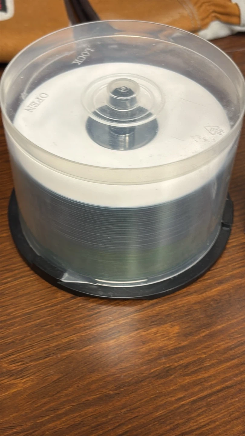 This spindle holds blank recordable CDs or DVDs. It's great for storing or transporting your discs. The clear plastic case has 'OPEN' and 'LOCK' indicators on the lid. Plus several disks !