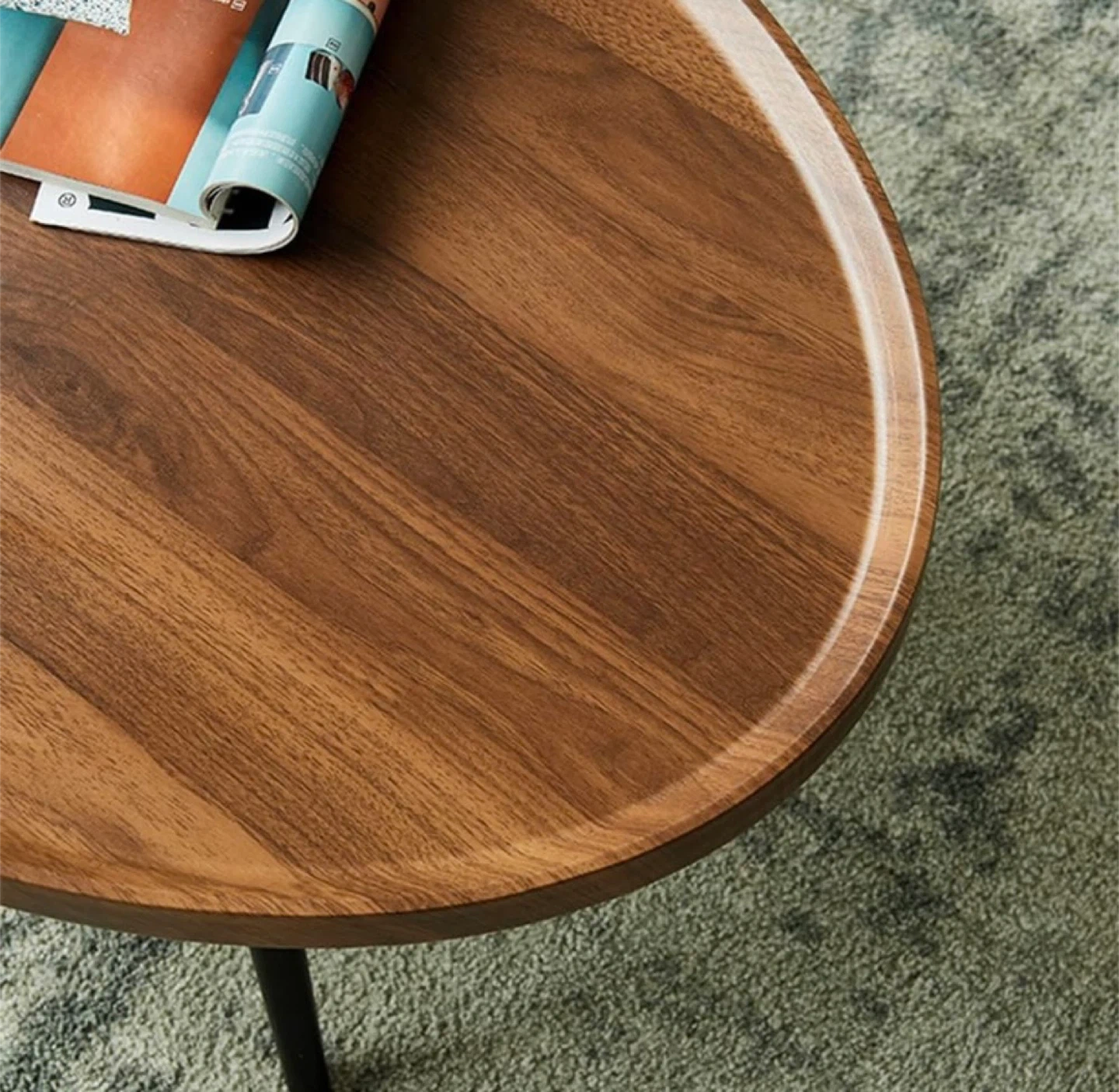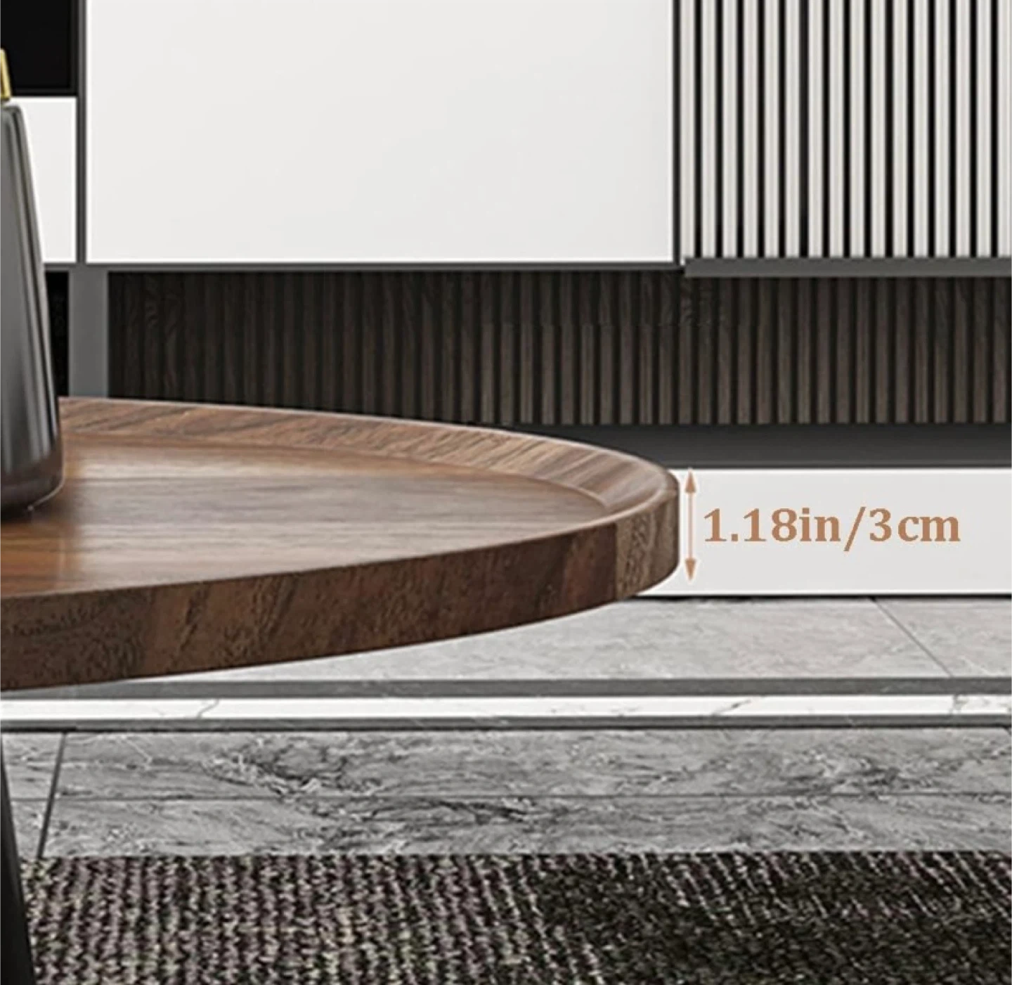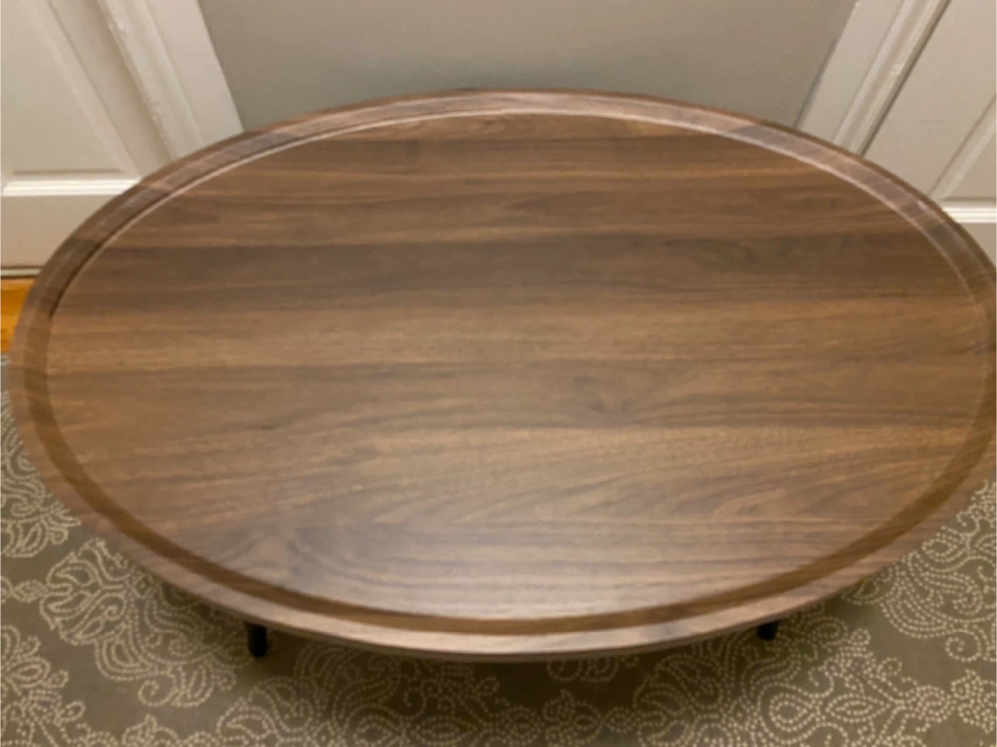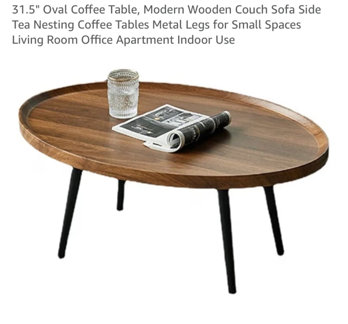 This oval coffee table is made of thick density fiberboard panel with veneer, which is waterproof and anti-scratch. 4 metal legs give the table a high degree of stability
