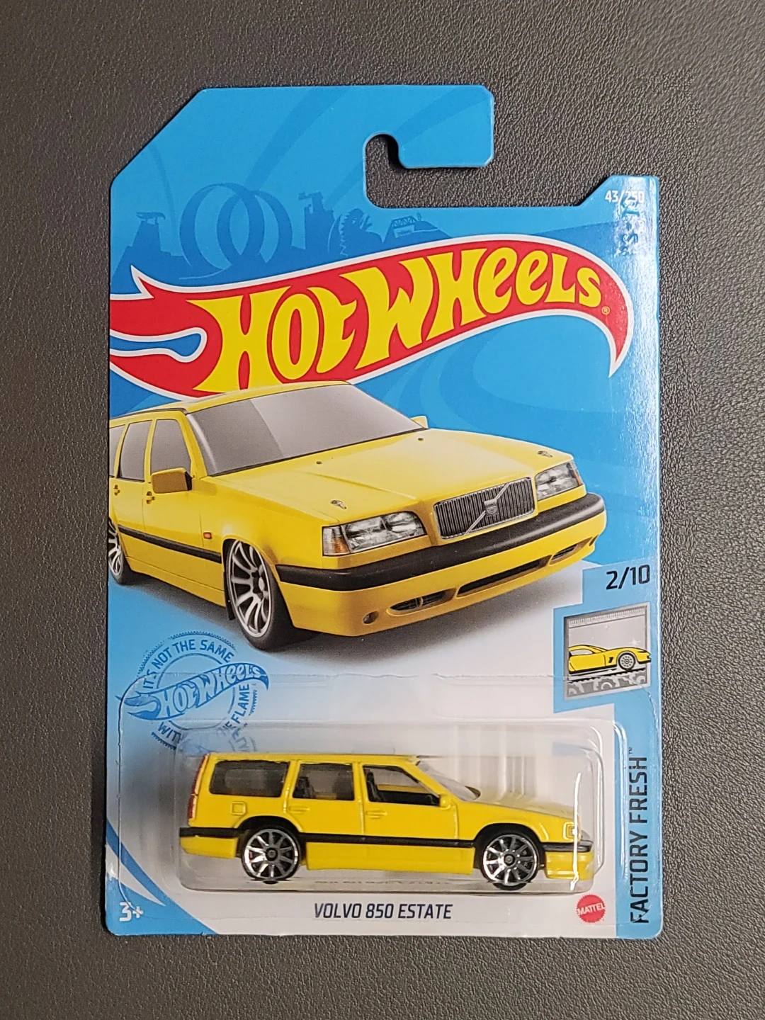 Yellow 1:64 scale die-cast model of the Volvo 850 Estate. This toy car is recommended for ages 3 and up. It's part of the Hot Wheels Factory Fresh collection.