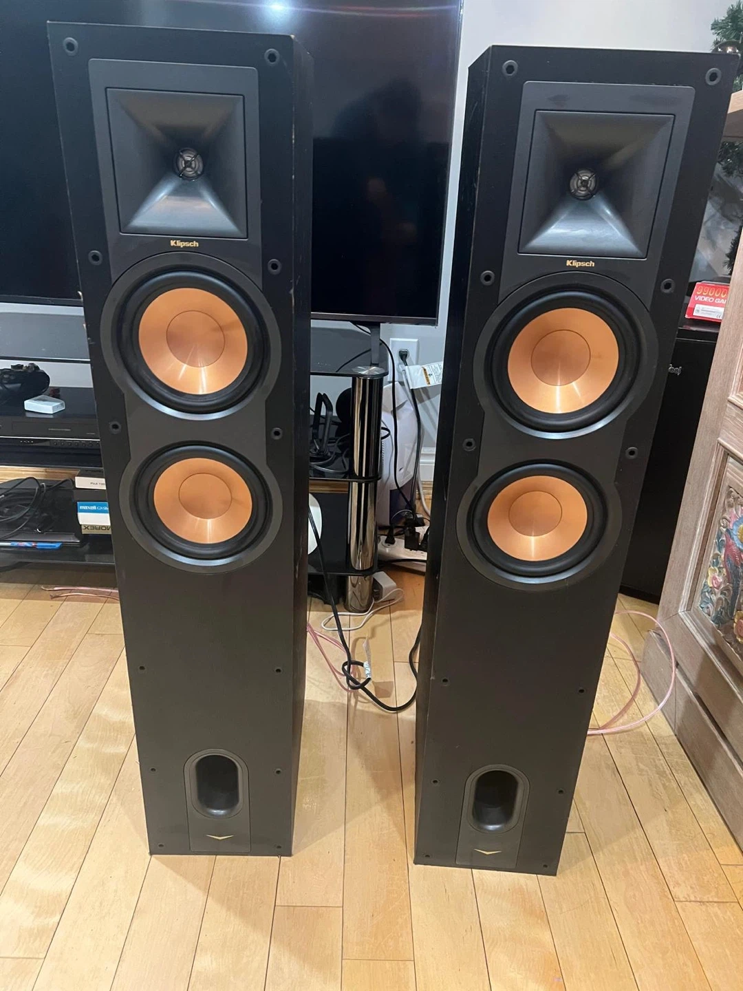 Selling a pair of Klipsch R-26F floorstanding speakers. These black tower speakers feature Klipsch's signature copper woofers and horn-loaded tweeters. They're ready to bring powerful sound to your home entertainment setup!