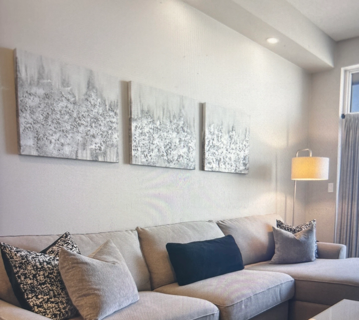 Three pieces of modern art. Canvas prints, abstract design. Grey and white colour scheme. Perfect for a living room or bedroom.