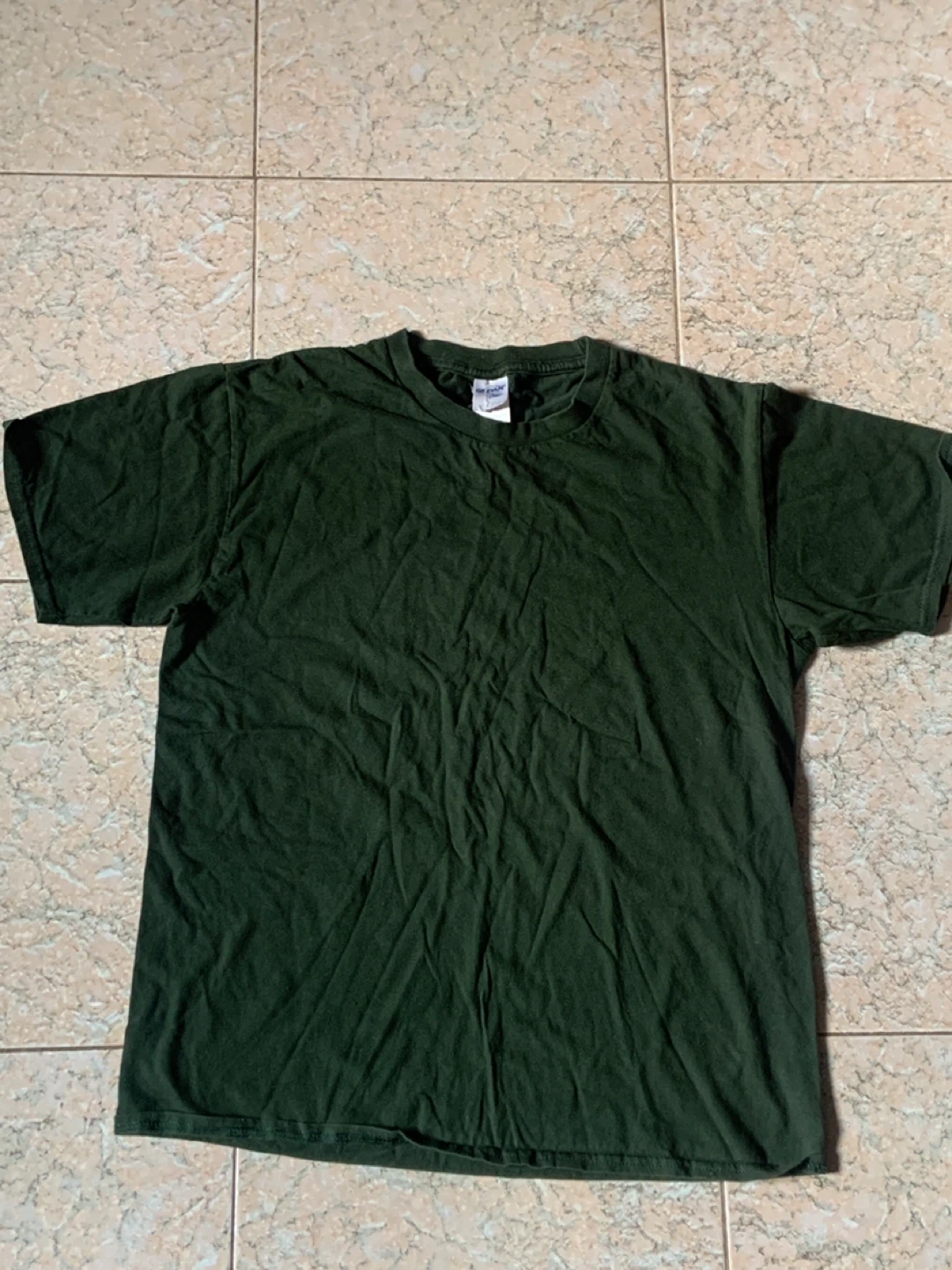 This is a Gildan dark green t-shirt. It's made of a soft cotton blend for comfort. This would be a great layering piece or for casual wear.