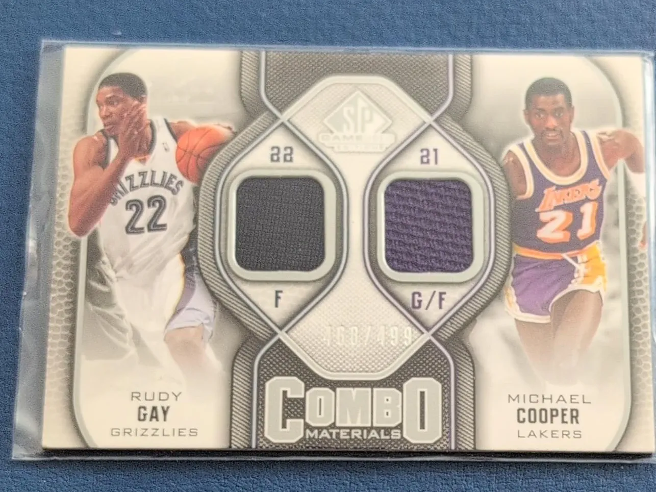 This is a 2009-10 SP Game Used "Combo Materials" trading card featuring Rudy Gay of the Memphis Grizzlies and Michael Cooper of the Los Angeles Lakers. It includes game-used memorabilia from both players. A great card for any basketball memorabilia collector!