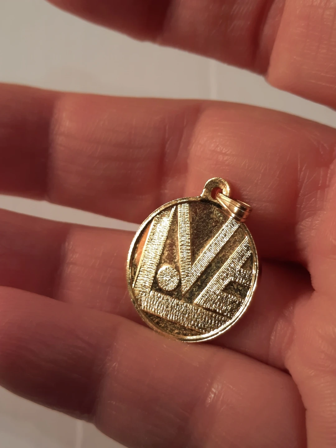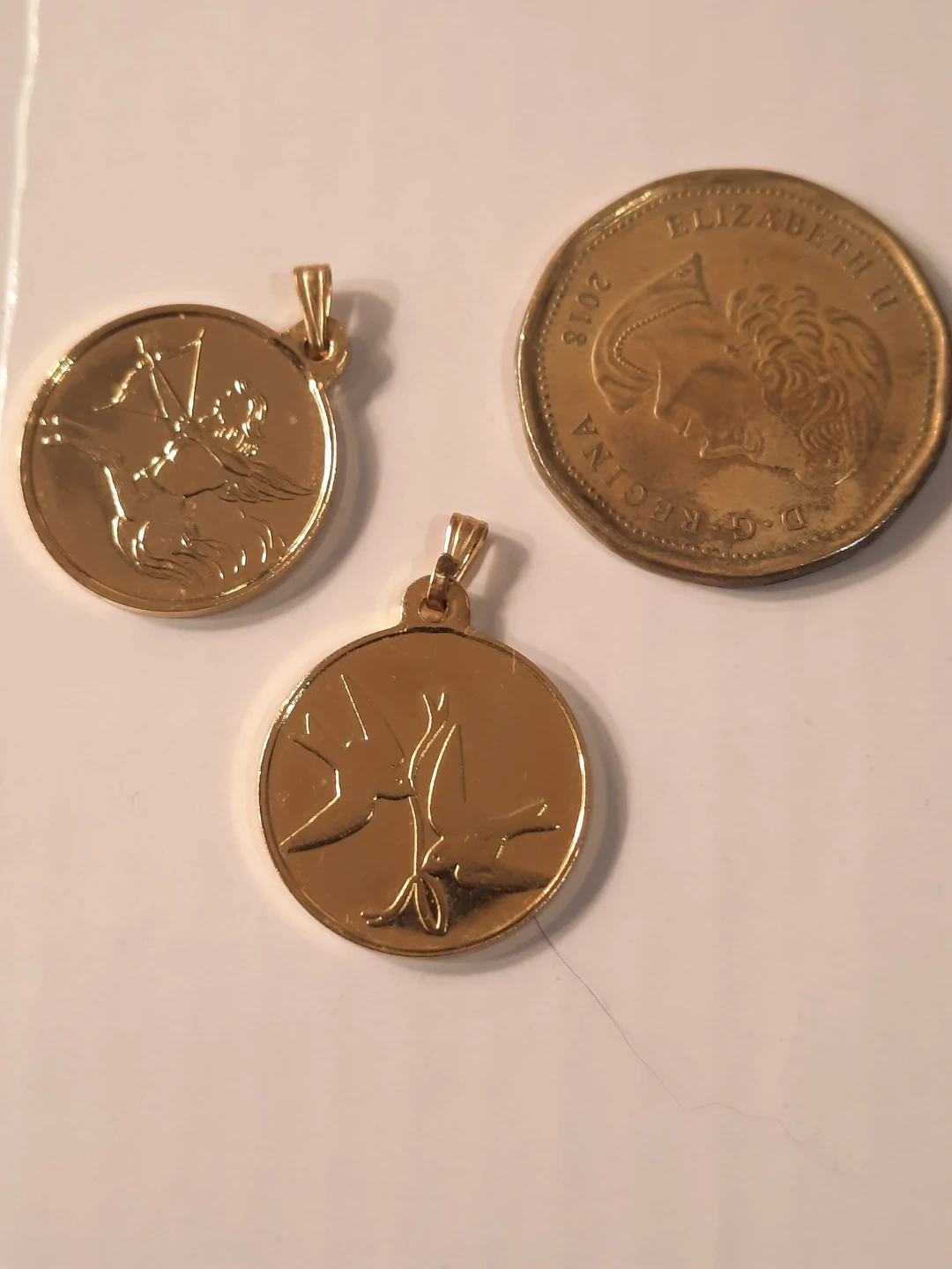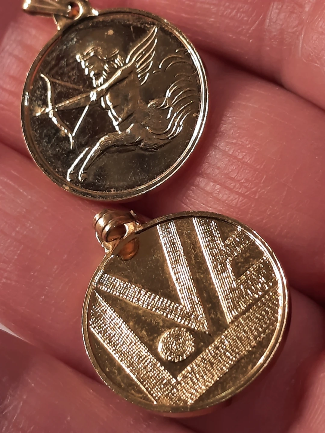 Two gold-tone gold platedmedallions, each featuring a different embossed design. One shows a celestial figure with a bow and arrow, possibly Cupid or Sagittarius. The other has an abstract design with what appears to be an 'M' or chevron pattern and a central circle. It's a nice set for crafting or personal adornment.one has 2 sides design.