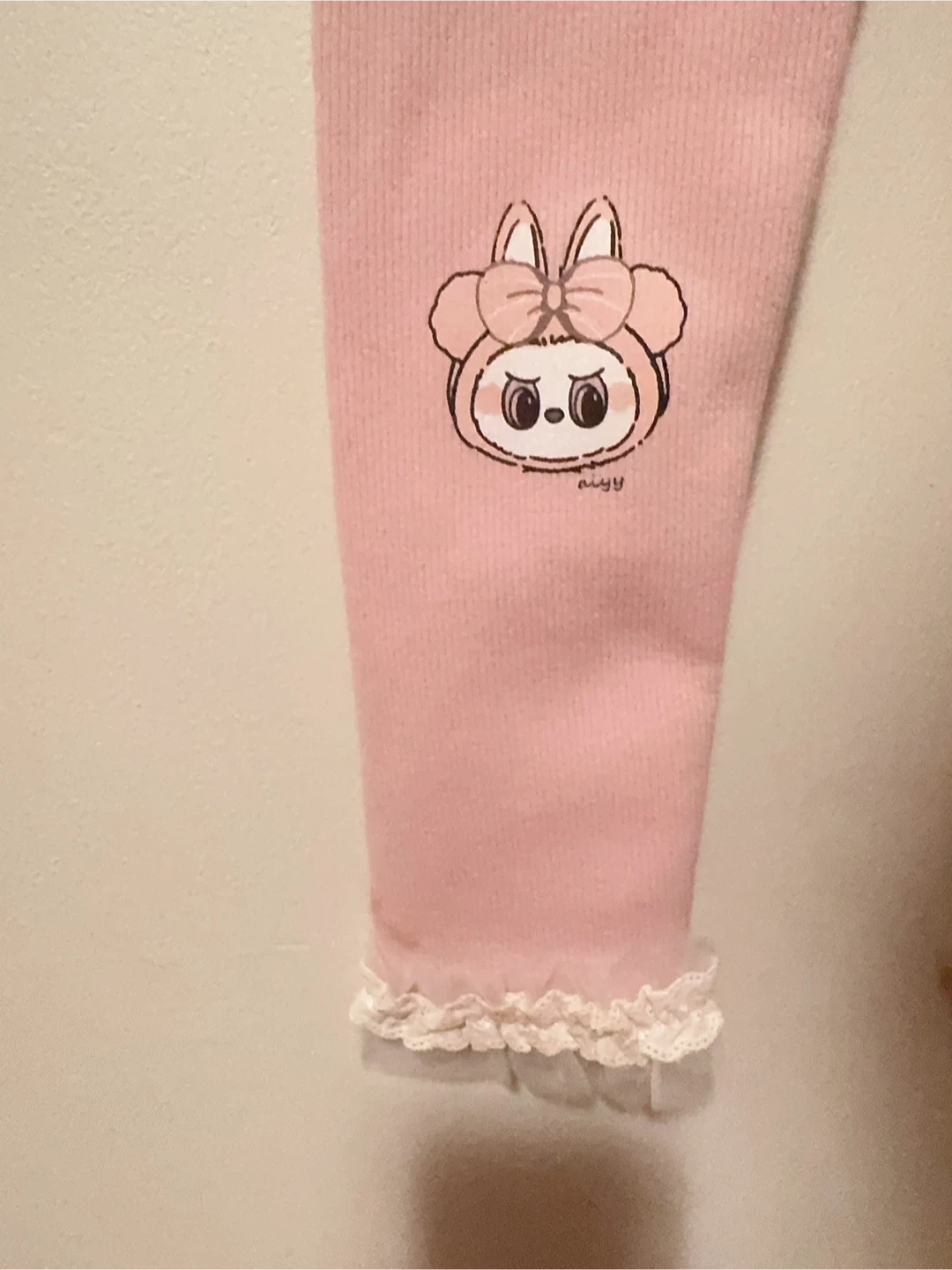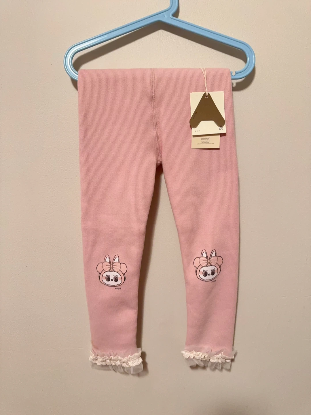 These cute pink leggings feature a ribbed texture and a Labubu graphic on each knee. They have delicate lace trim at the ankles. Made from a soft material, also fleece inner layer, they're perfect for keeping little ones comfy.