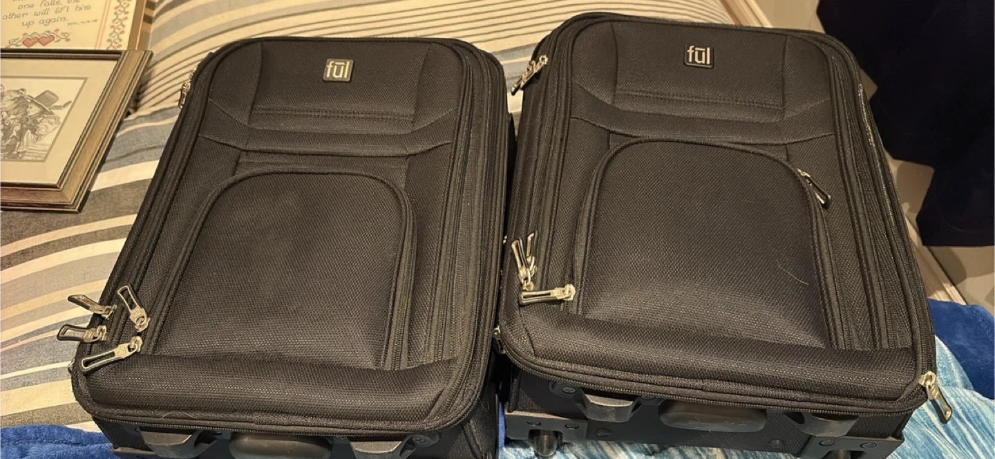 Selling two black Ful carry-on suitcases. They're made of durable fabric and feature smooth-rolling wheels. These are great for weekend trips or as part of a larger travel ensemble!