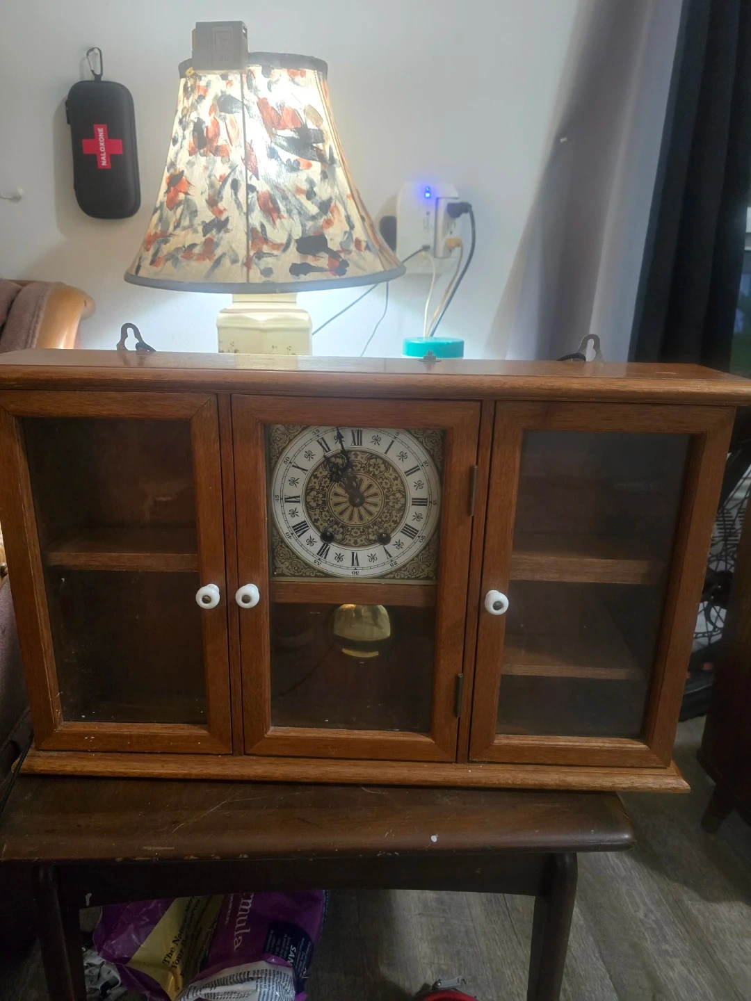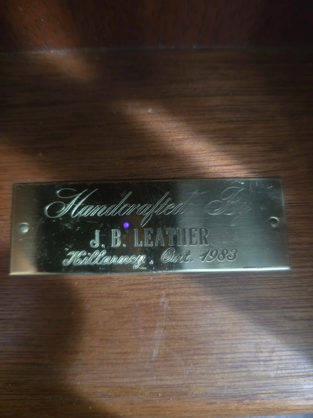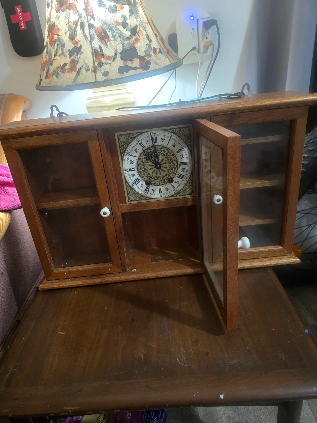 A handcrafted wooden cabinet with a clock face. Features glass doors and interior shelving. Made by J.B. Leather in Killarney, Ont. in 1983. One of a kind piece. I dont know the clock maker and cant find him on Google so it makes it a one of a kind piece. Probably the only one he made like this. It is missing a few shelves on the left .....the clock dont work ....but easy to get working its gravity operated no batteries needed so its just a few clips that are missing on the back of the clock......so im asking best offer for it I know if you like clocks this one is a good one .... operates on it own power and keeps time like nothing ever before it ....when its working .....but its awesome want a part of history then buy this its like 40 years old and has some jazz to it it looks awesome for like mantel piece even if it dont work its still awesome for decor.
