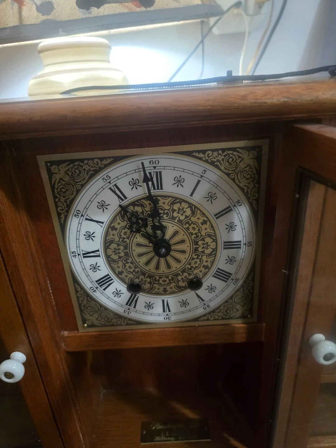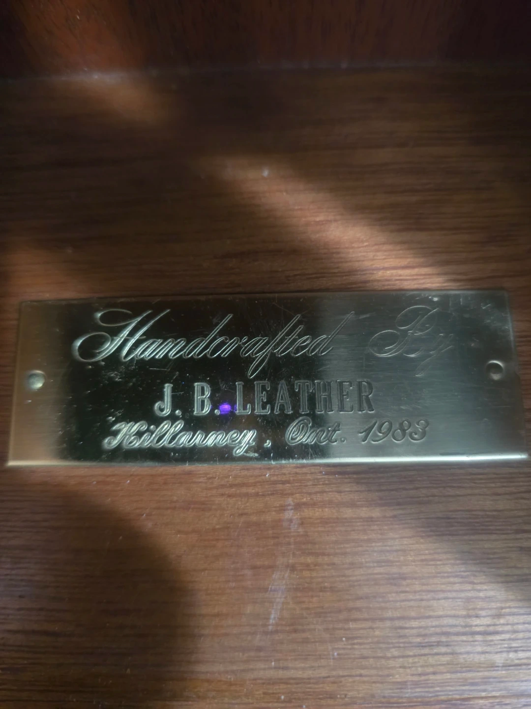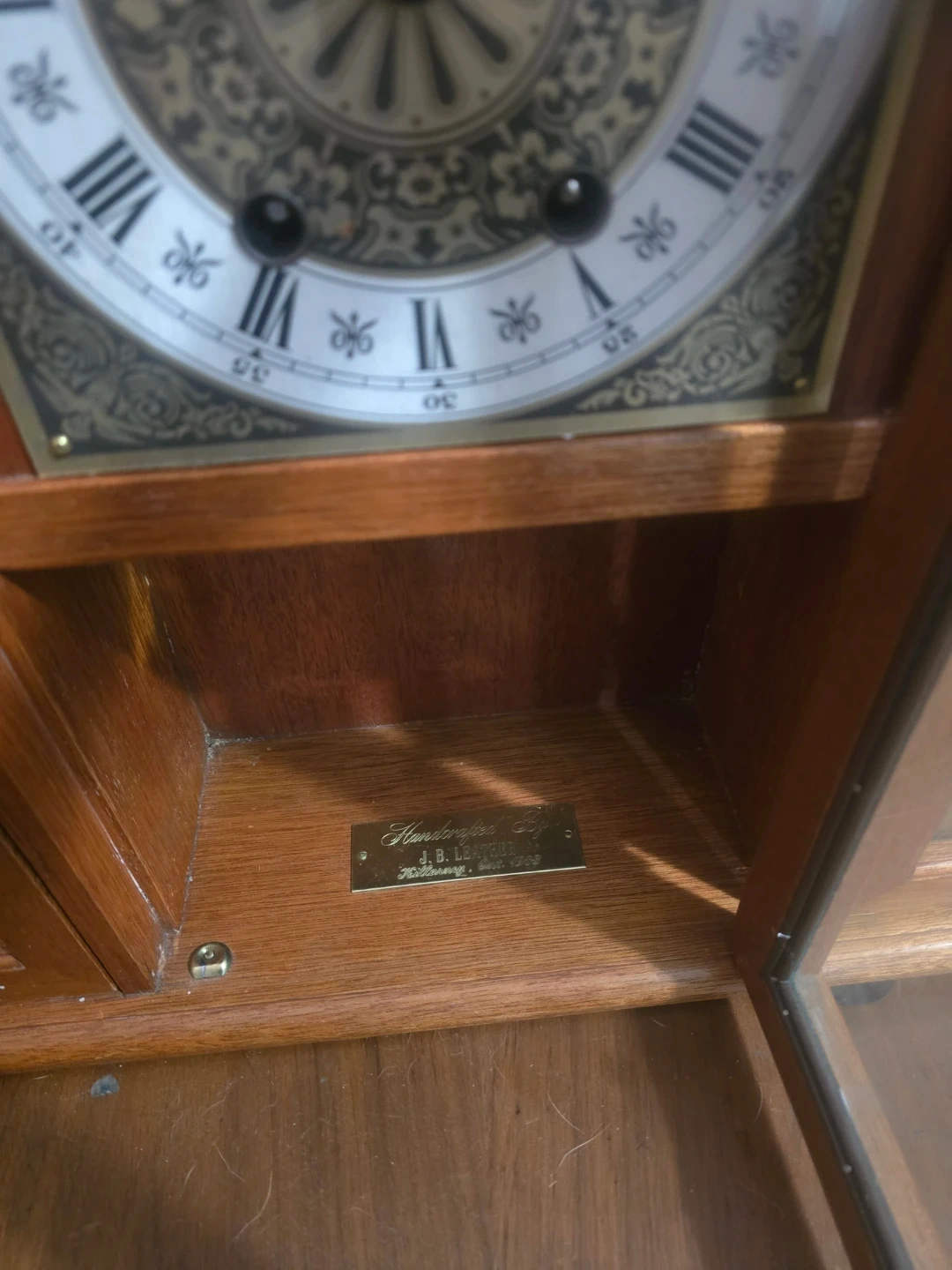A handcrafted wooden cabinet with a clock face. Features glass doors and interior shelving. Made by J.B. Leather in Killarney, Ont. in 1983. One of a kind piece. I dont know the clock maker and cant find him on Google so it makes it a one of a kind piece. Probably the only one he made like this. It is missing a few shelves on the left .....the clock dont work ....but easy to get working its gravity operated no batteries needed so its just a few clips that are missing on the back of the clock......so im asking best offer for it I know if you like clocks this one is a good one .... operates on it own power and keeps time like nothing ever before it ....when its working .....but its awesome want a part of history then buy this its like 40 years old and has some jazz to it it looks awesome for like mantel piece even if it dont work its still awesome for decor.