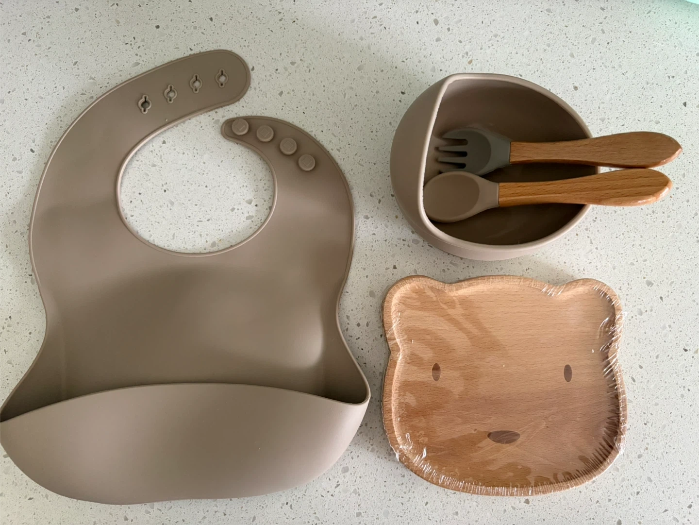 Never used baby solid food starter set! Have 2 more that are same and very good for a newborn starting on solids. It has a bowl 🥣 🥄 spoon 🍴 fork , bib and a wooden plate still wrapped in plastic as it is new.