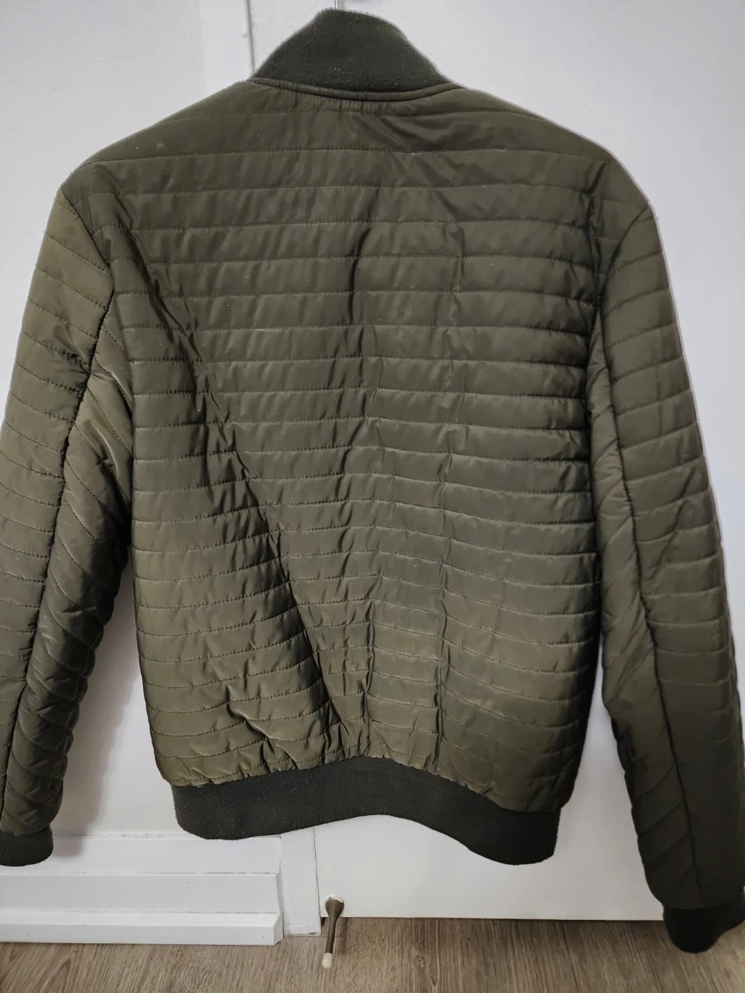 Selling an H&M bomber jacket in olive green. It's a quilted style and in great condition! Size is 36R.
