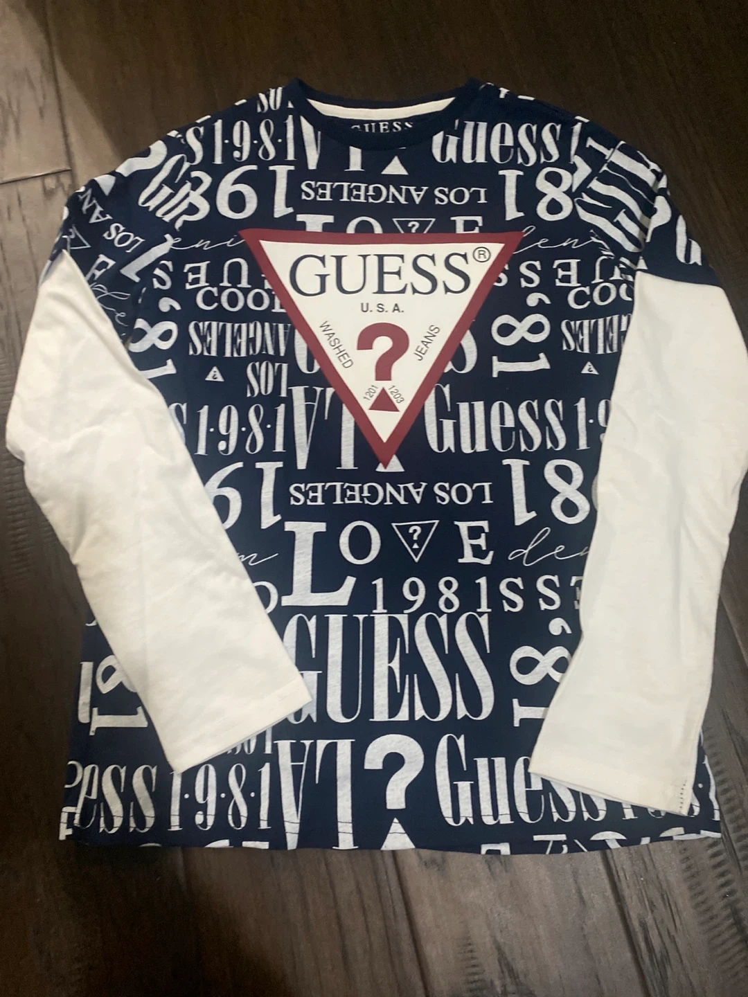 This Guess Kids long-sleeved shirt is a size 12. It features a navy body with a repeating Guess logo and text pattern, and white sleeves. Made in Bangladesh. Boys