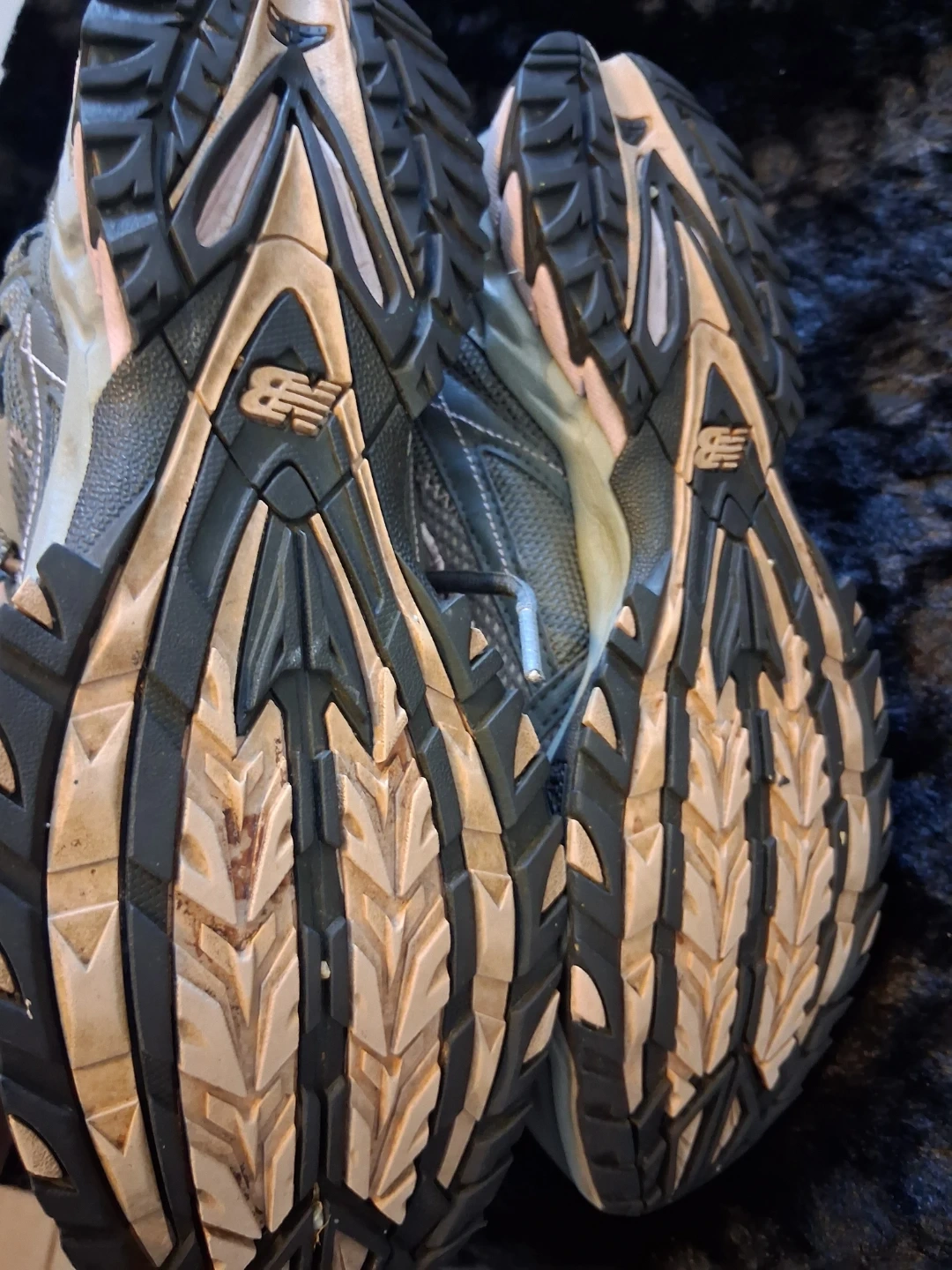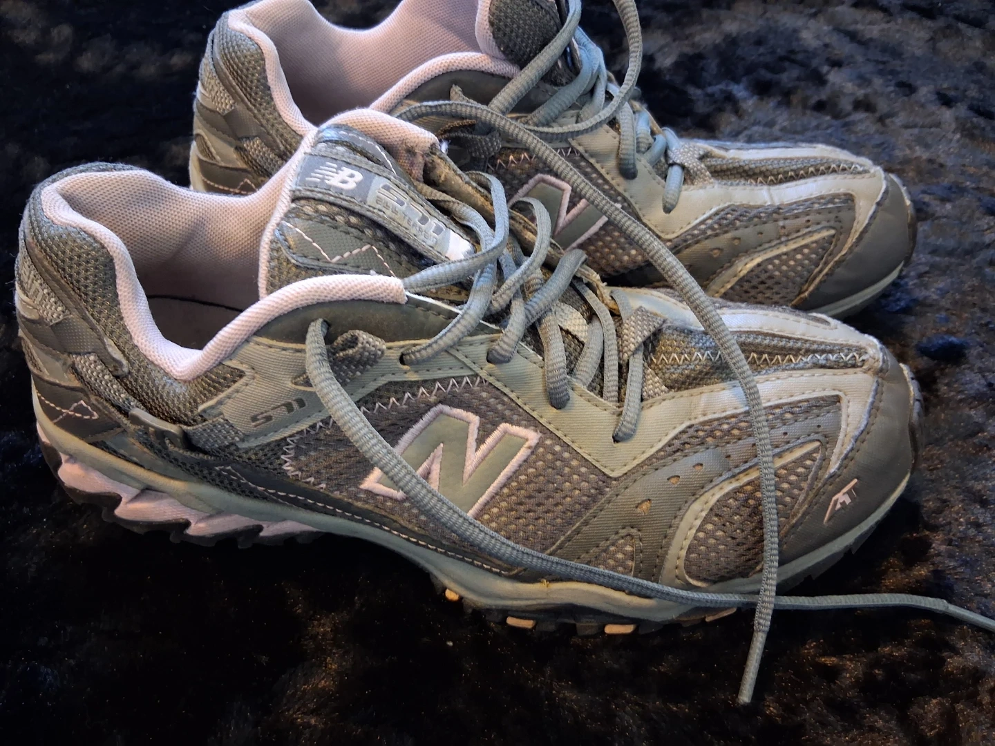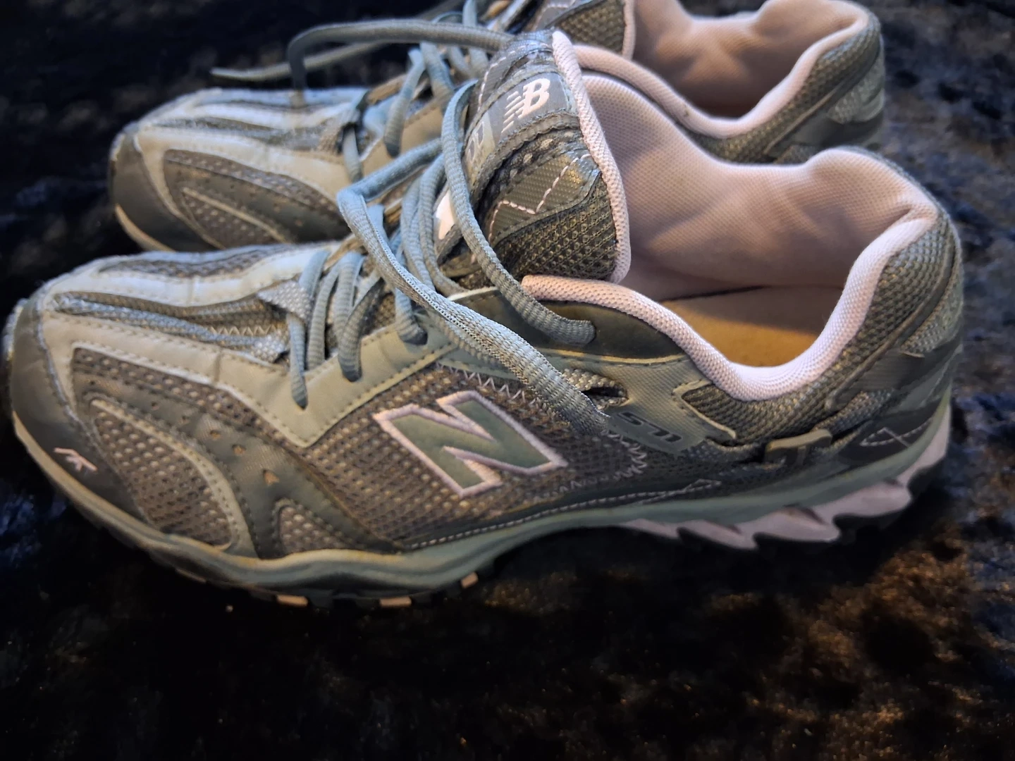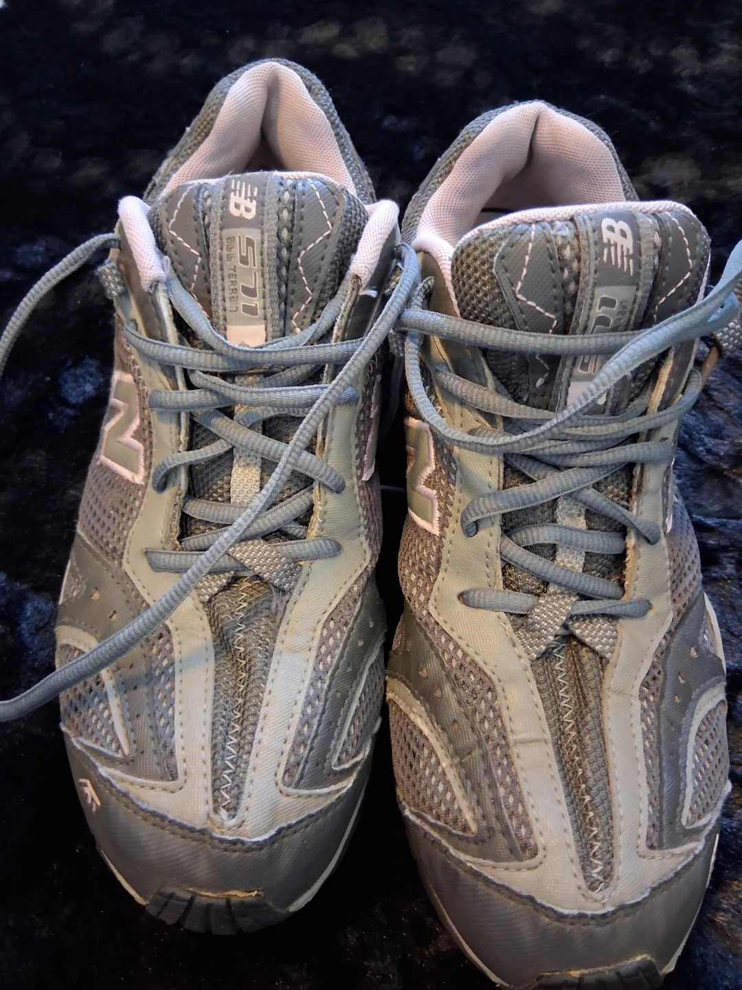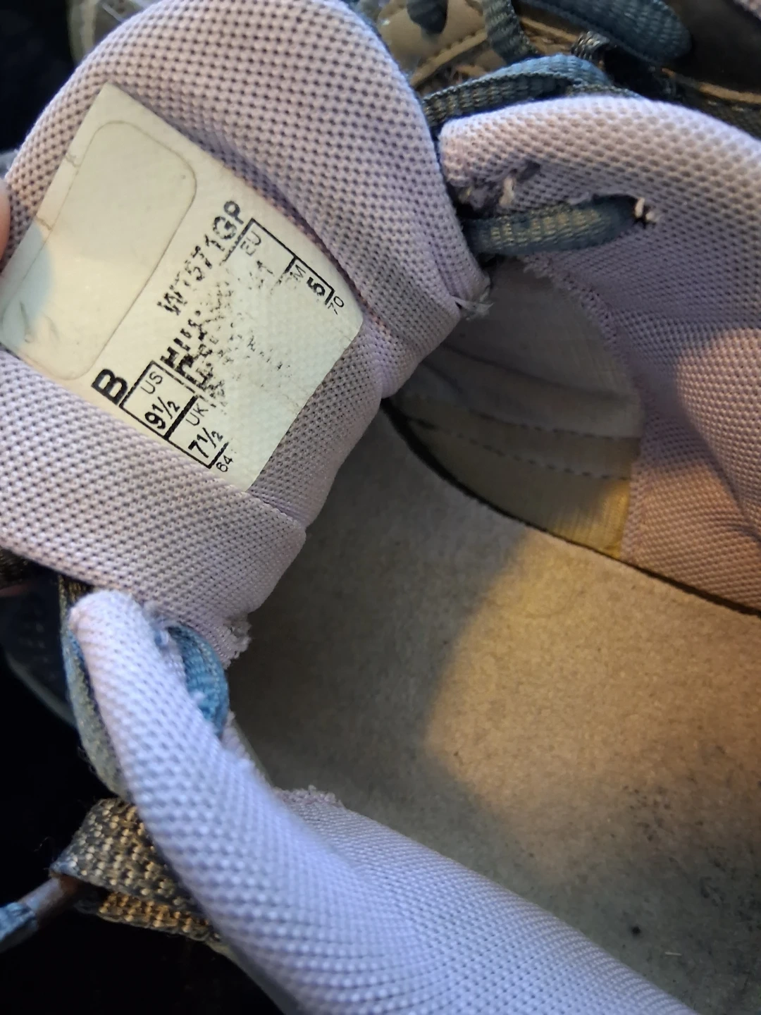These are women's New Balance 577 running shoes. They are a size 9.5 US. The shoes are made of a mesh and synthetic material.