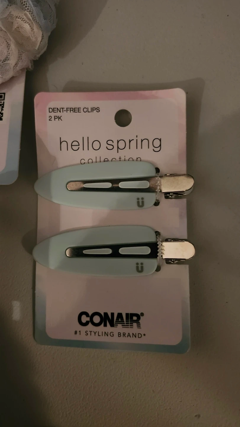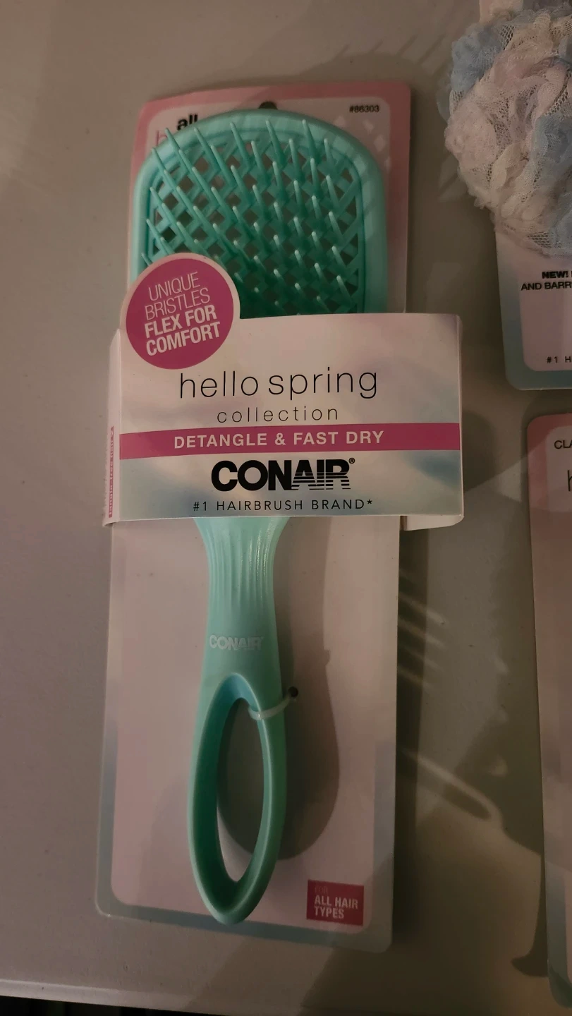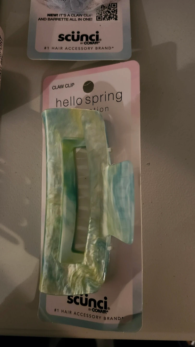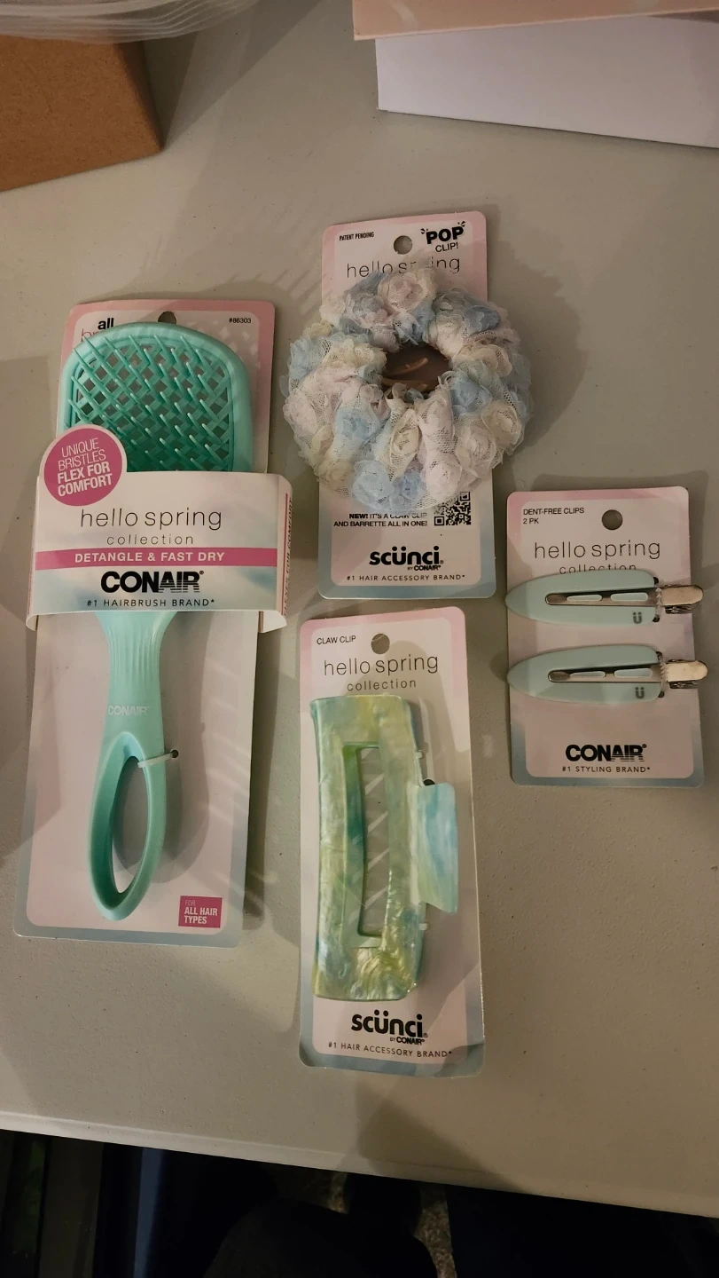 A collection of hair accessories from the Scunci Hello Spring line. It includes a claw clip, a scrunchie, dent-free clips, and a detangle & fast dry hairbrush. These items are great for everyday styling and hair care.