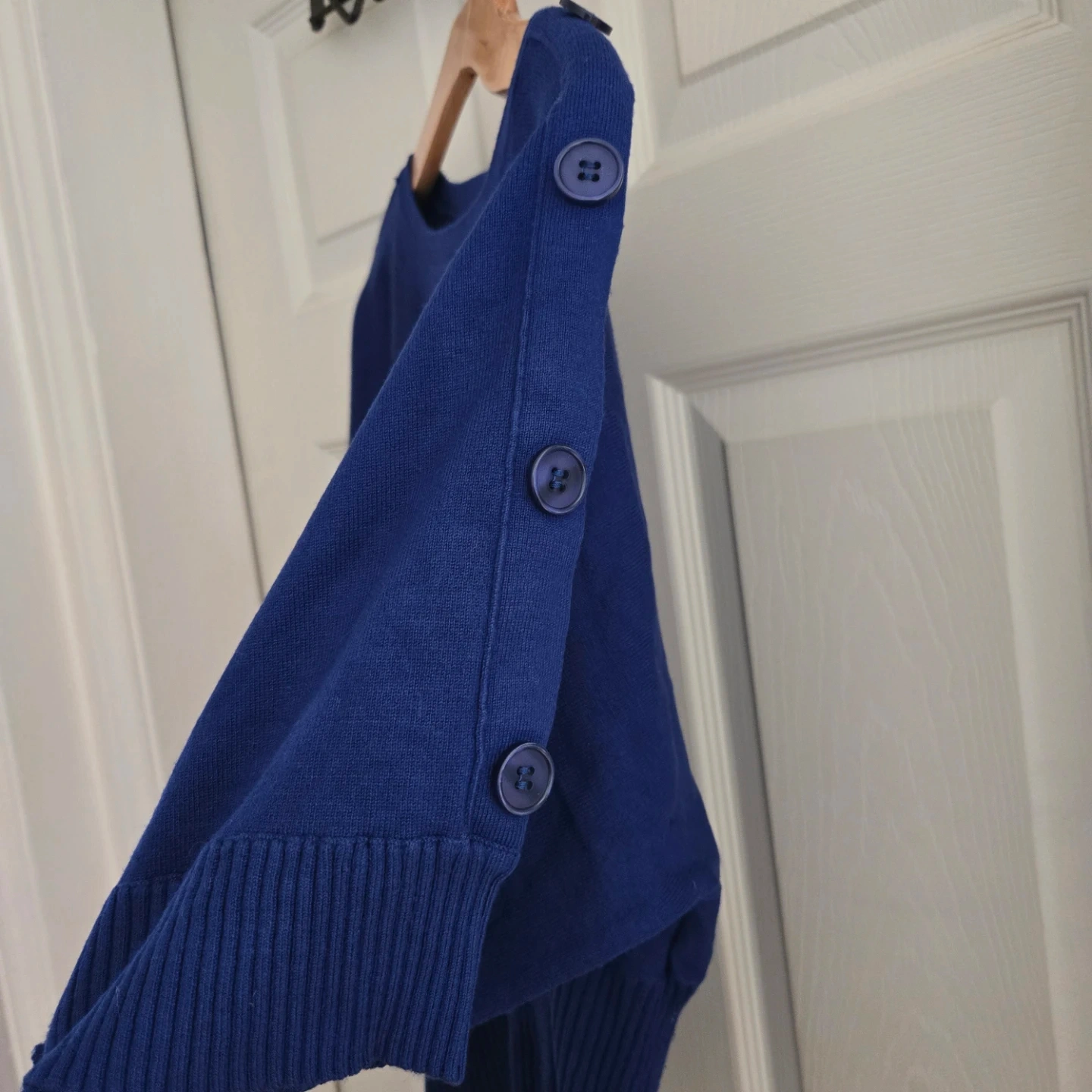 This is a blue Cable & Gauge sweater in size small. It features decorative buttons on the sleeves. Ribbed hem detail.