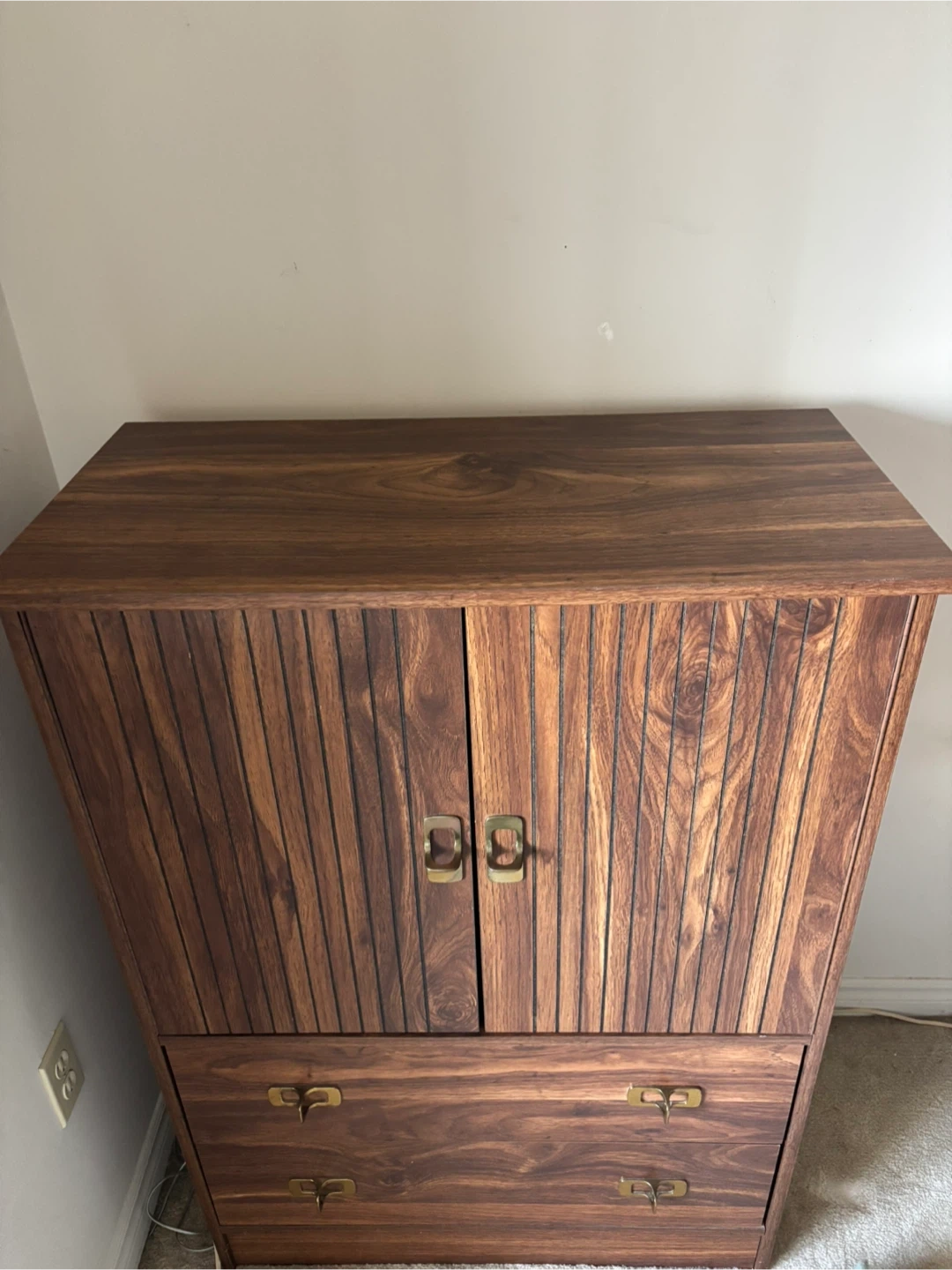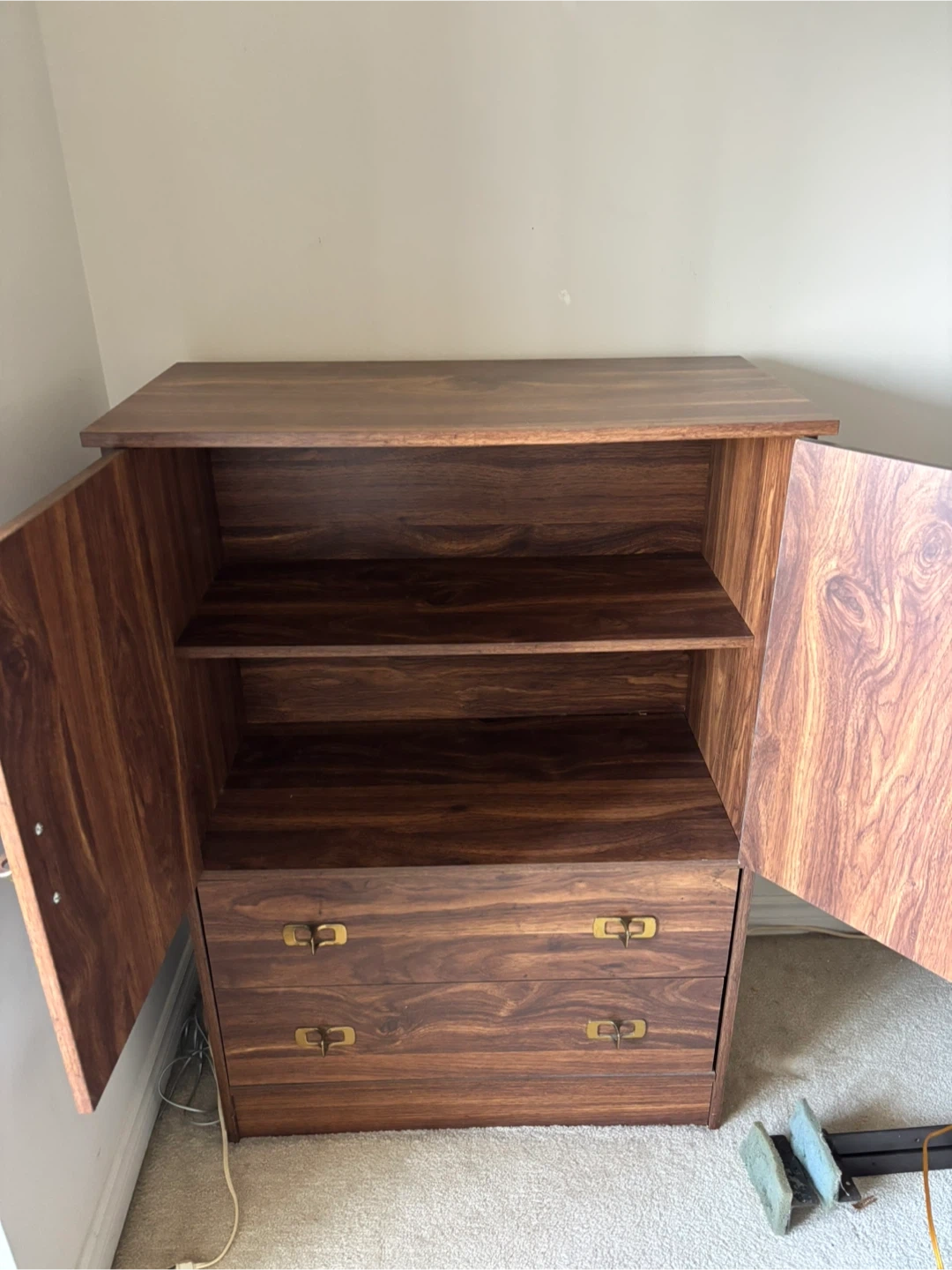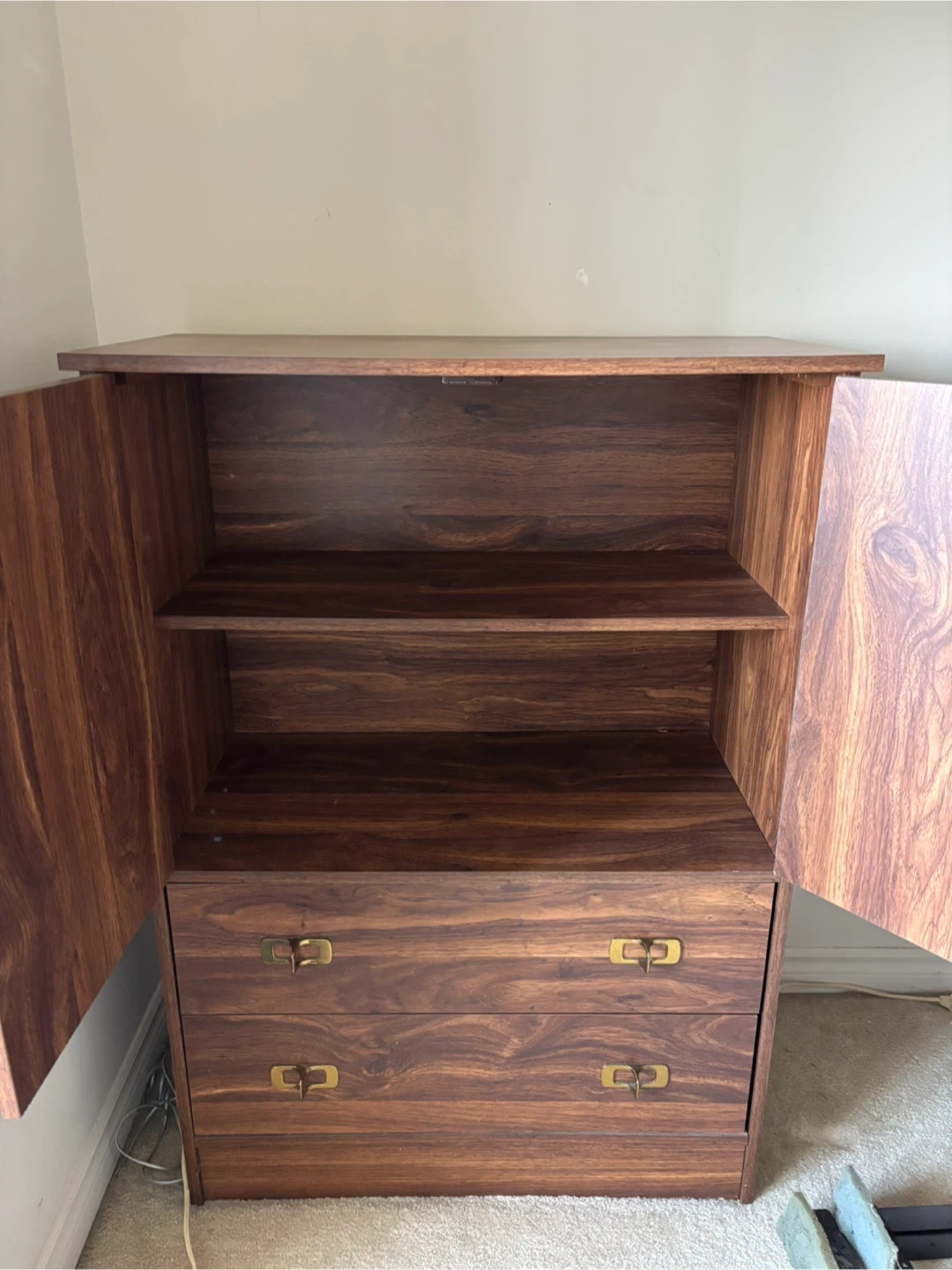 A nice wooden cabinet with two doors and two drawers. Inside there are two shelves and one drawer.