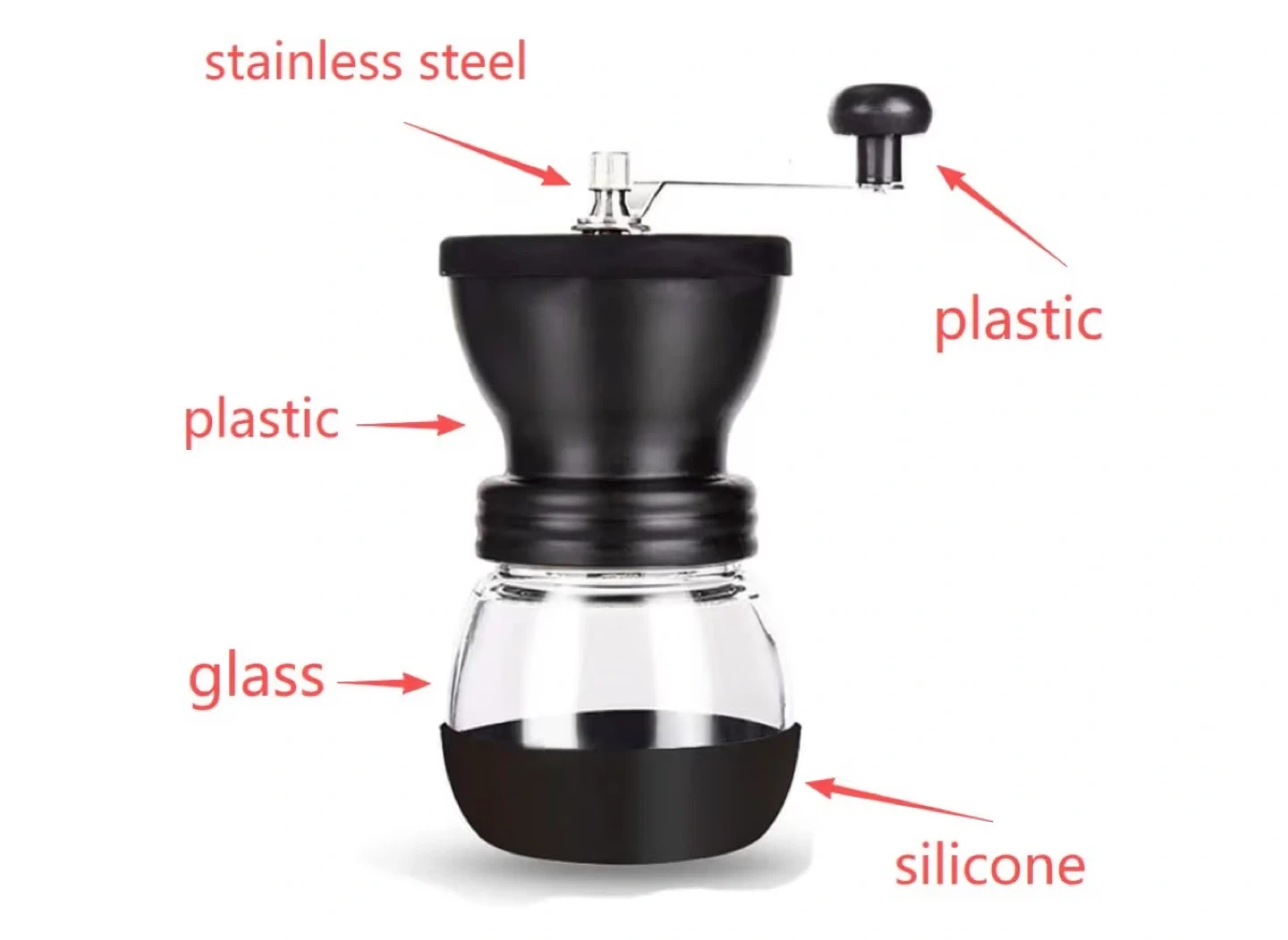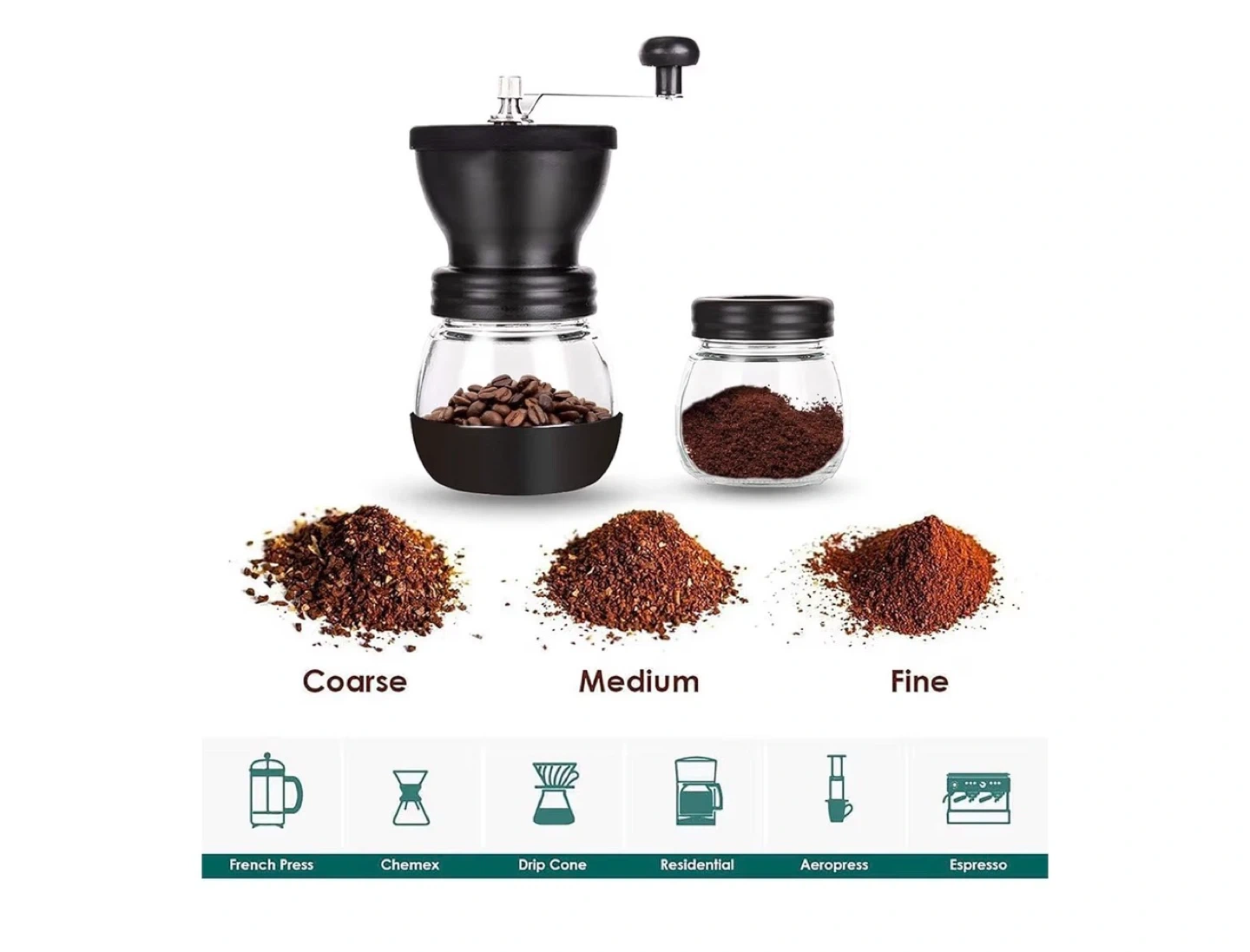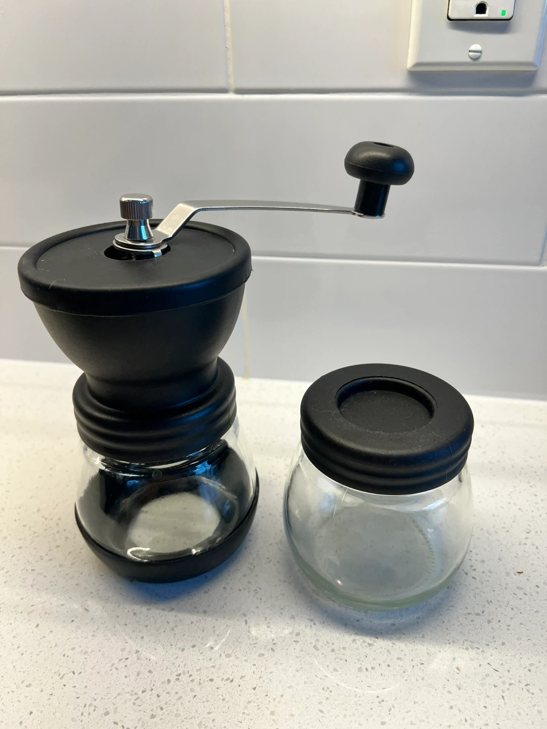 Selling a manual coffee bean grinder with a glass base and silicone grip.