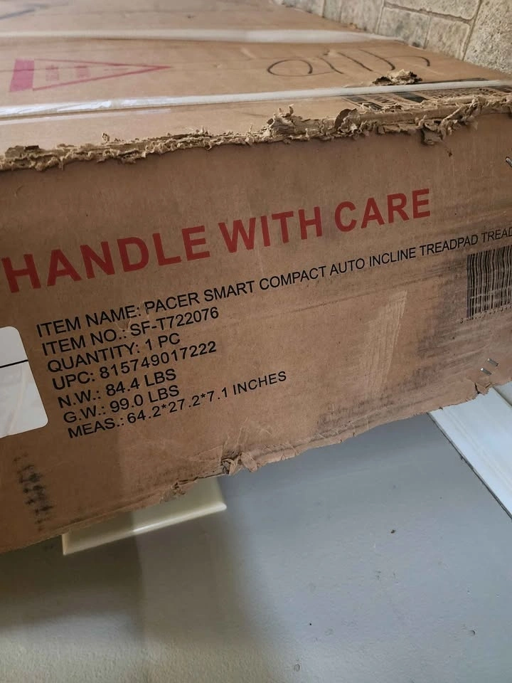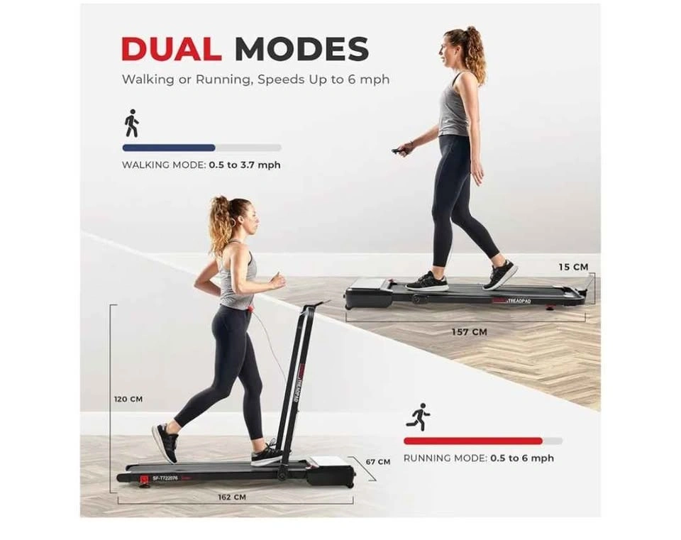 Brand new in box. Treadpad pacer dual mode walking/running treadmill. Has 6 level auto incline, remote control, exclusive SunnyFit app & Bluetooth. Use with or without handles. Easily slides under a desk, or lets you run up to 9.66 km/hr (6 mph).