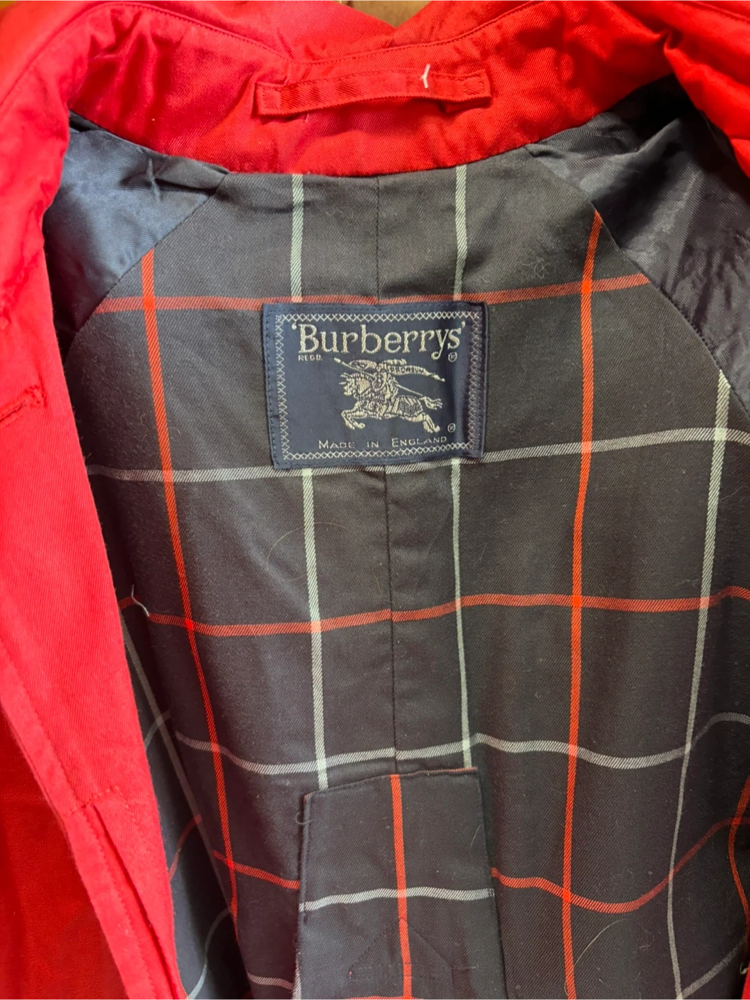 Classic Burberrys trench coat in vibrant red. Features the iconic Nova Check lining. Made in England. Cotton/polyester blend.