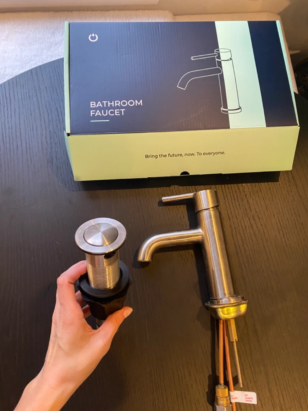 This is a new satin nickel faucet with a stainless steel braided hose. It's 20 inches long and has a 3/8" compression connection. Includes drain assembly with seal still on. Great for a bathroom sink upgrade! See last photo for some discolouration on the faucet handle.