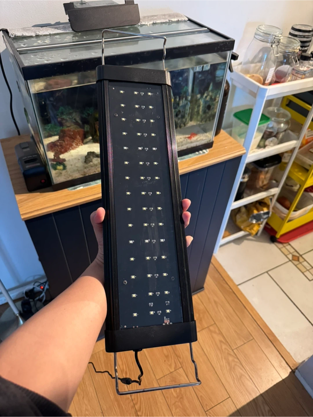 This is an LED aquarium light fixture designed for freshwater or saltwater tanks. It's a black fixture with adjustable arms to fit different tank sizes. The light provides bright illumination for your aquatic life.