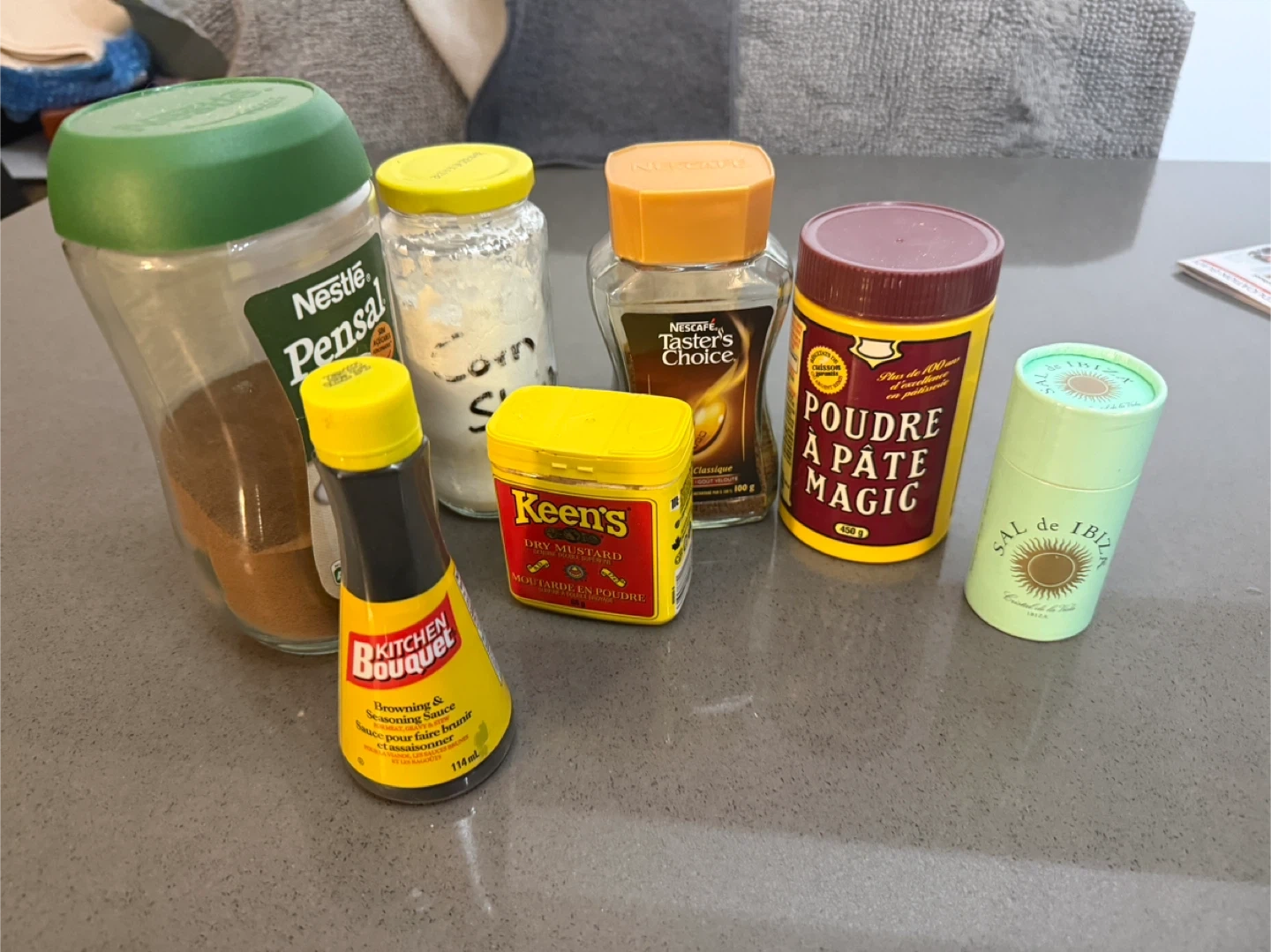 Includes Kitchen Bouquet Browning & Seasoning Sauce, Nestlé Pental, Keen's Dry Mustard, Nescafé Taster's Choice coffee, Poudre à Pâte Magic, and Sal de Ibiza. Various sizes available.