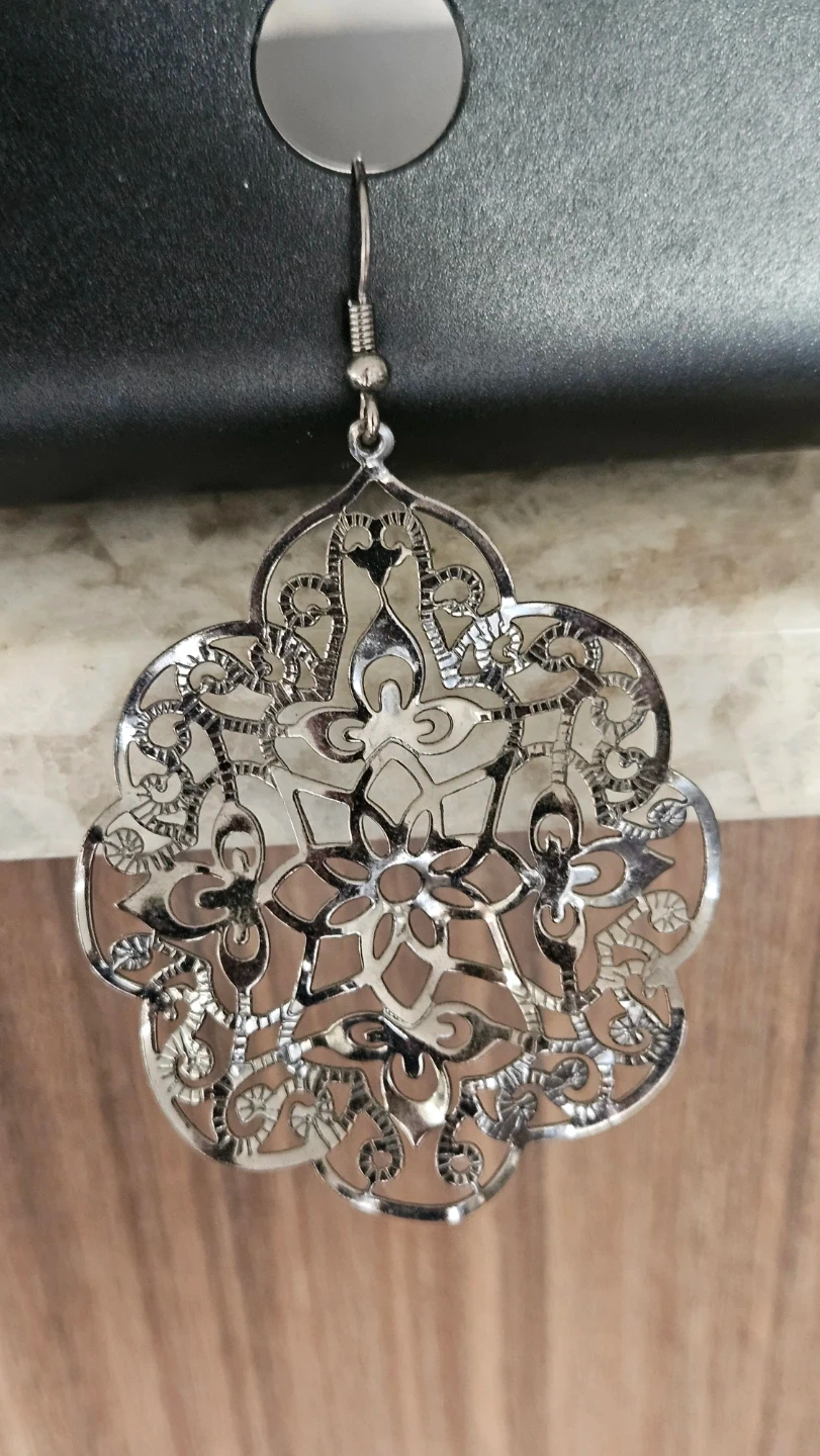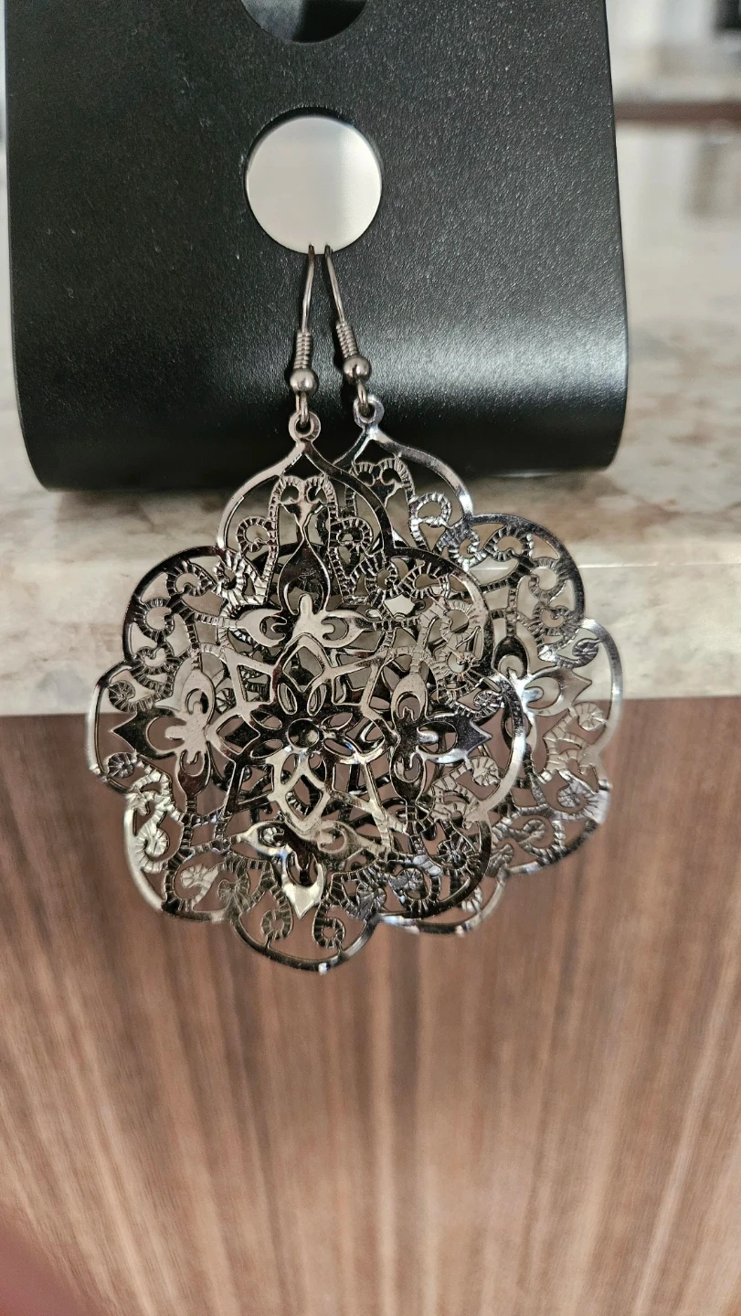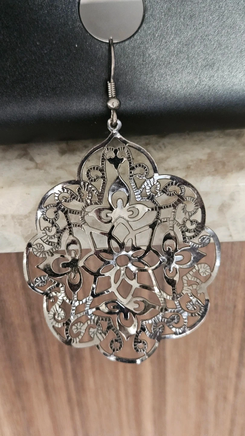 Selling a pair of silver-tone floral dangle earrings. They have a beautiful filigree design and are brand new, never used. Perfect for a gift or adding a touch of elegance to any outfit!