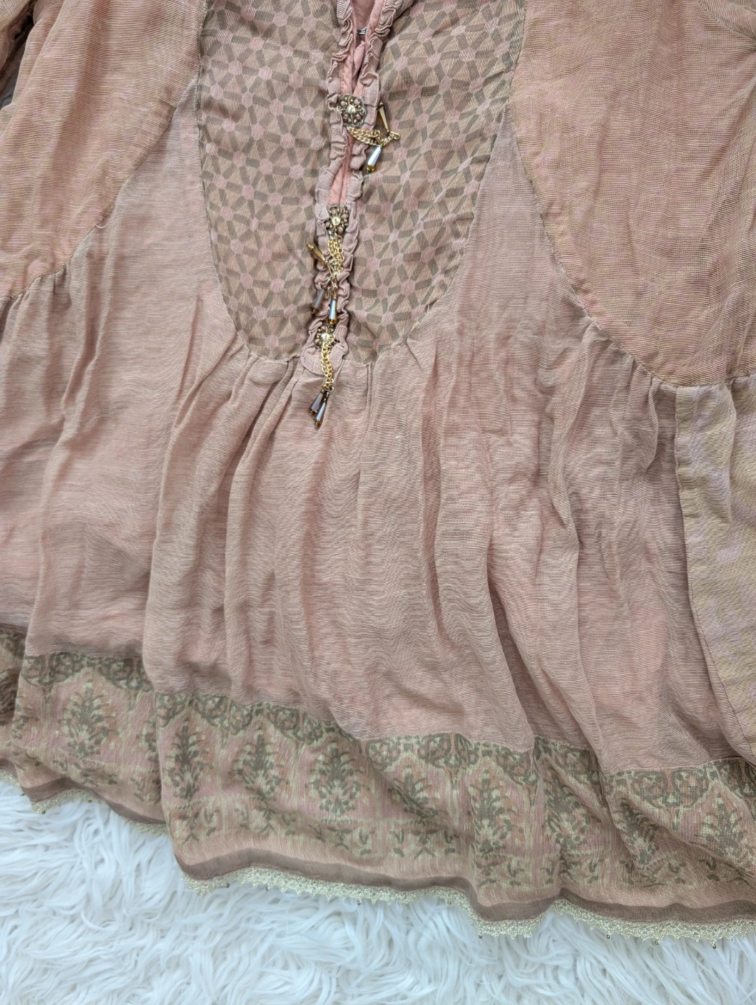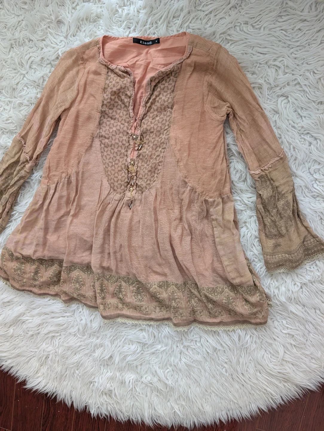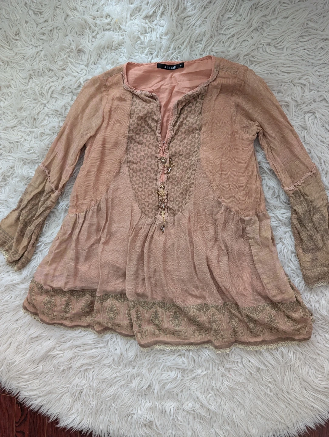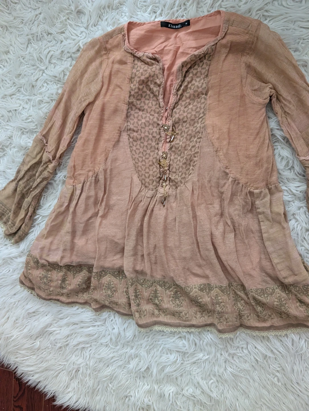 This Khaadi tunic top is a lovely shade of pink/peach with intricate embroidery on the yoke and sleeves. It features a V-neckline with button detailing and a flowy, tiered hemline. It's perfect for a casual outing or can be dressed up for a slightly more formal occasion.
