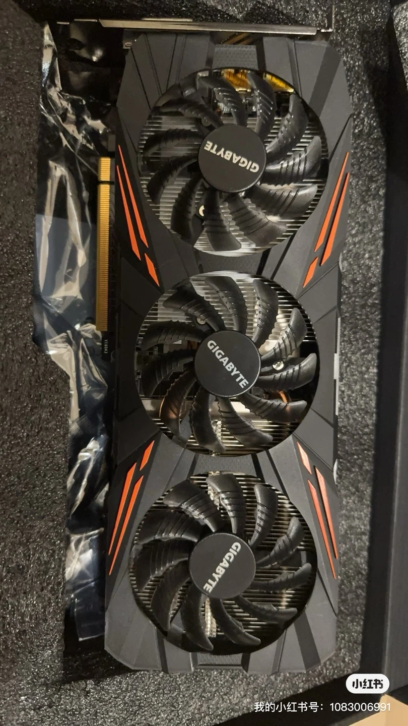 This is a GIGABYTE GeForce GTX 1070 graphics card with 8GB of GDDR5 memory. It features three fans for cooling and is a Gaming OC model. The card is in good working order, tested with FurMark.