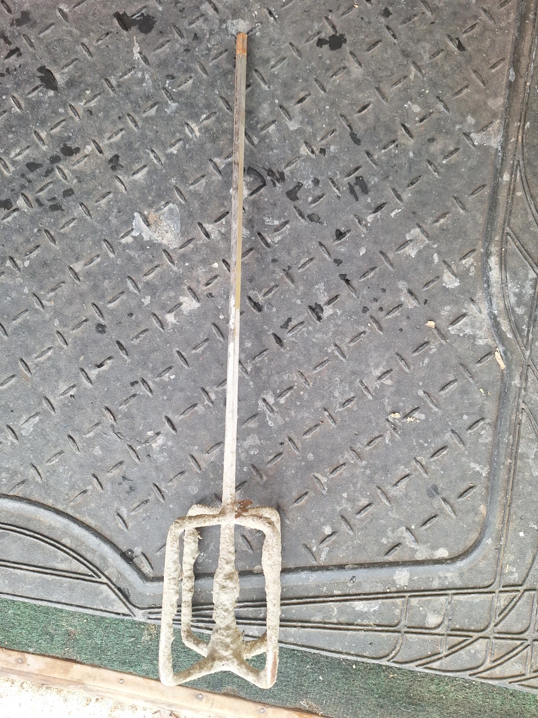 This is a mixer attachment for paint or drywall mud. It's made of metal and shows signs of use, with dried material on the paddles. This attachment is designed to fit most standard drills.