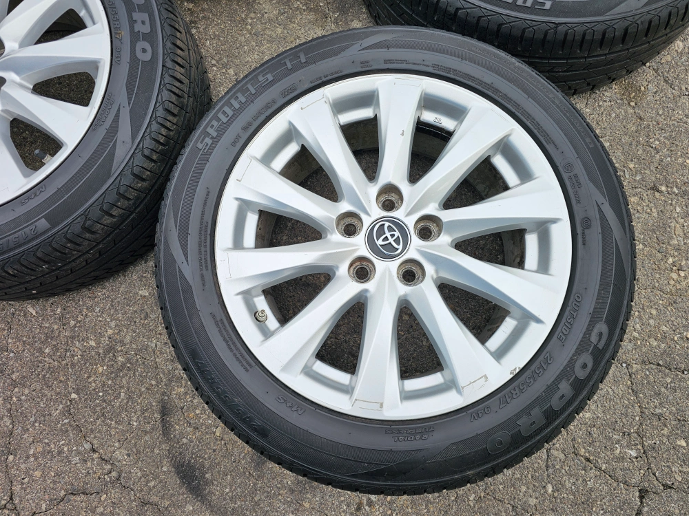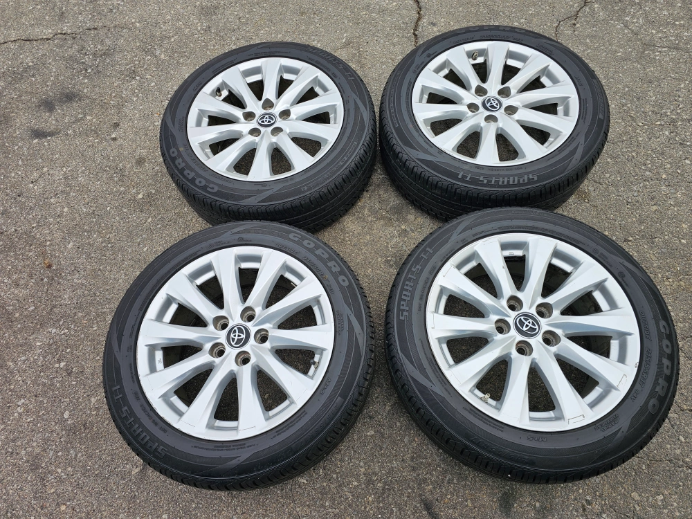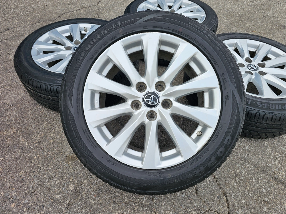 Set of 4 original 17" Toyota camry rims with all season tires on them 215/55/R17. Rims and tires are in good shape, no issues. Tires are almost brand new with approximately 90% thread left on them. TPMS INSTALLED