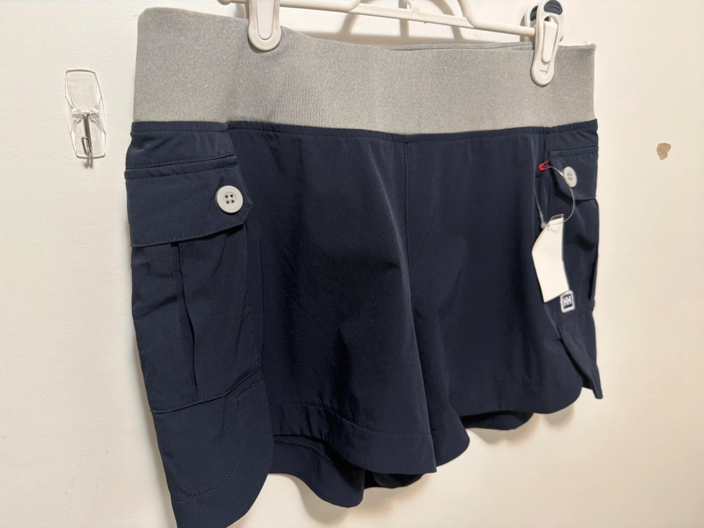 Helly Hansen women's shorts in navy. Size M/regular. Designed and developed in Norway since 1877. These shorts feature a grey elastic waistband and button-closure cargo pockets. These are brand new with tag.
