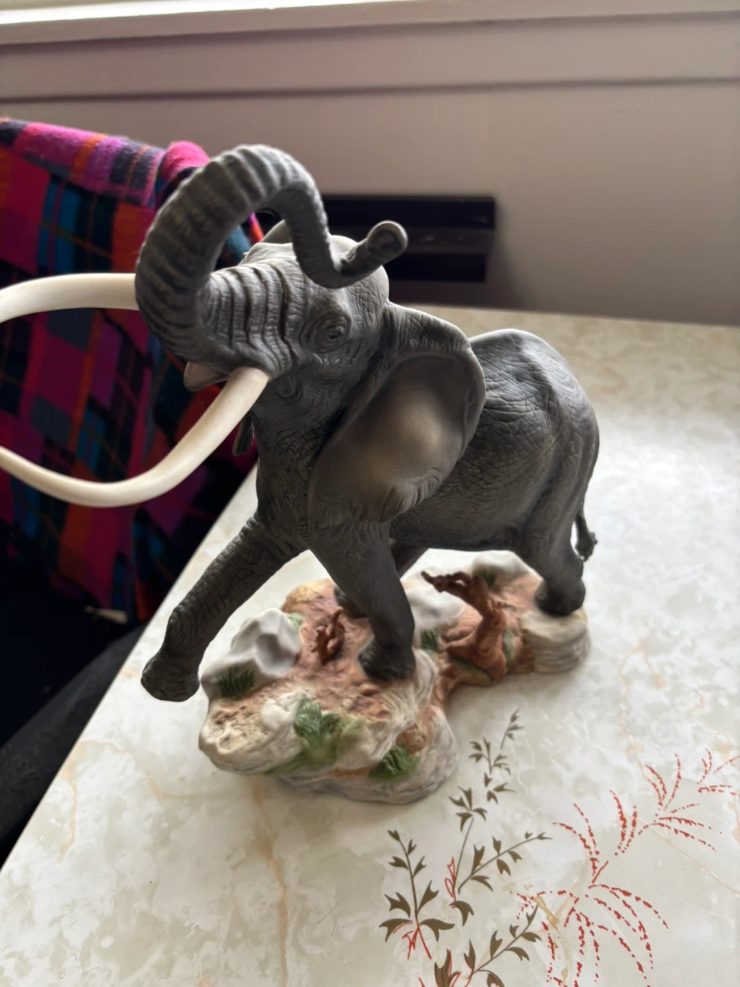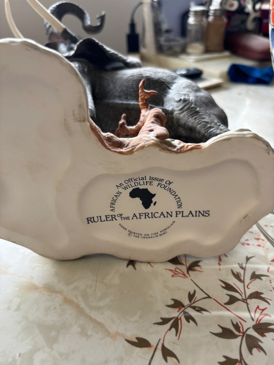 This is an official issue from the African Wildlife Foundation. Hand-painted on fine porcelain, it depicts an elephant on a rocky base. It's a detailed collectible piece.