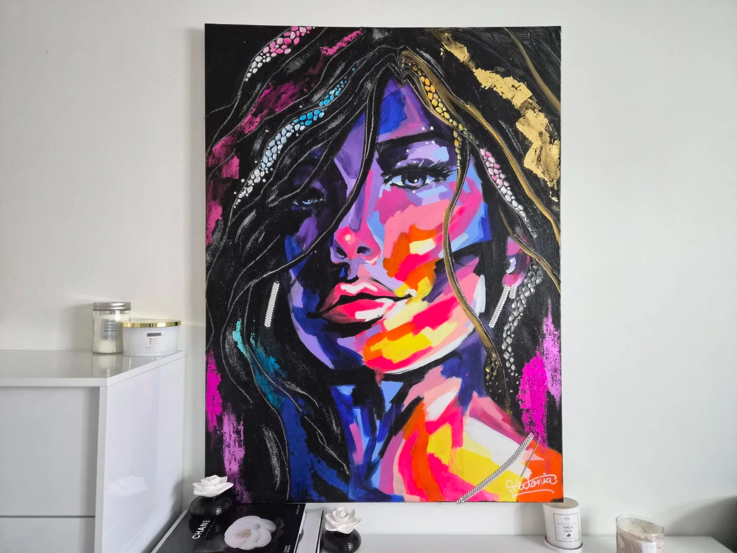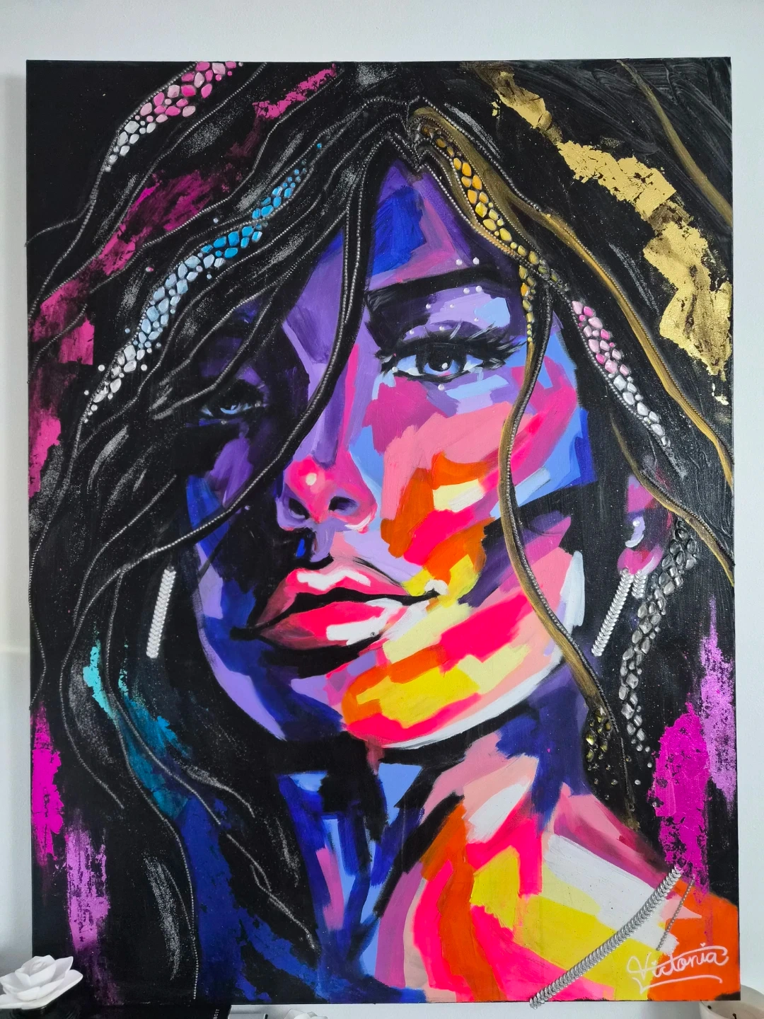Unique abstract art featuring a woman's portrait in bold colours and textures. This eye-catching canvas adds a splash of personality to any space. Created by yours truly "Victoria Lukasiuk"