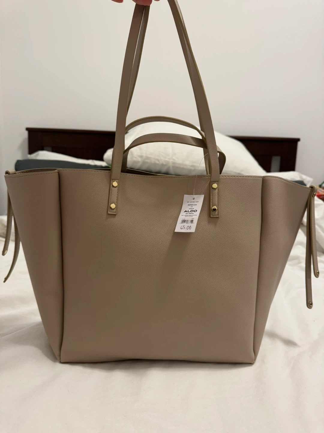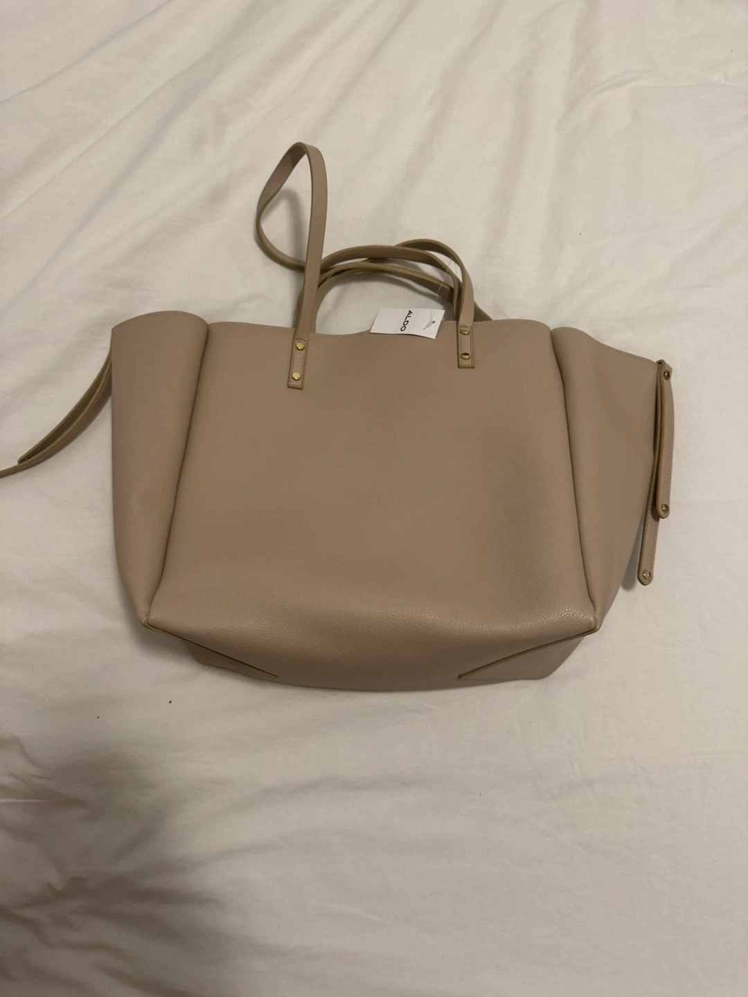 This is an ALDO tote bag in a tan faux leather material. It has double top handles and a spacious interior. Perfect for everyday use!