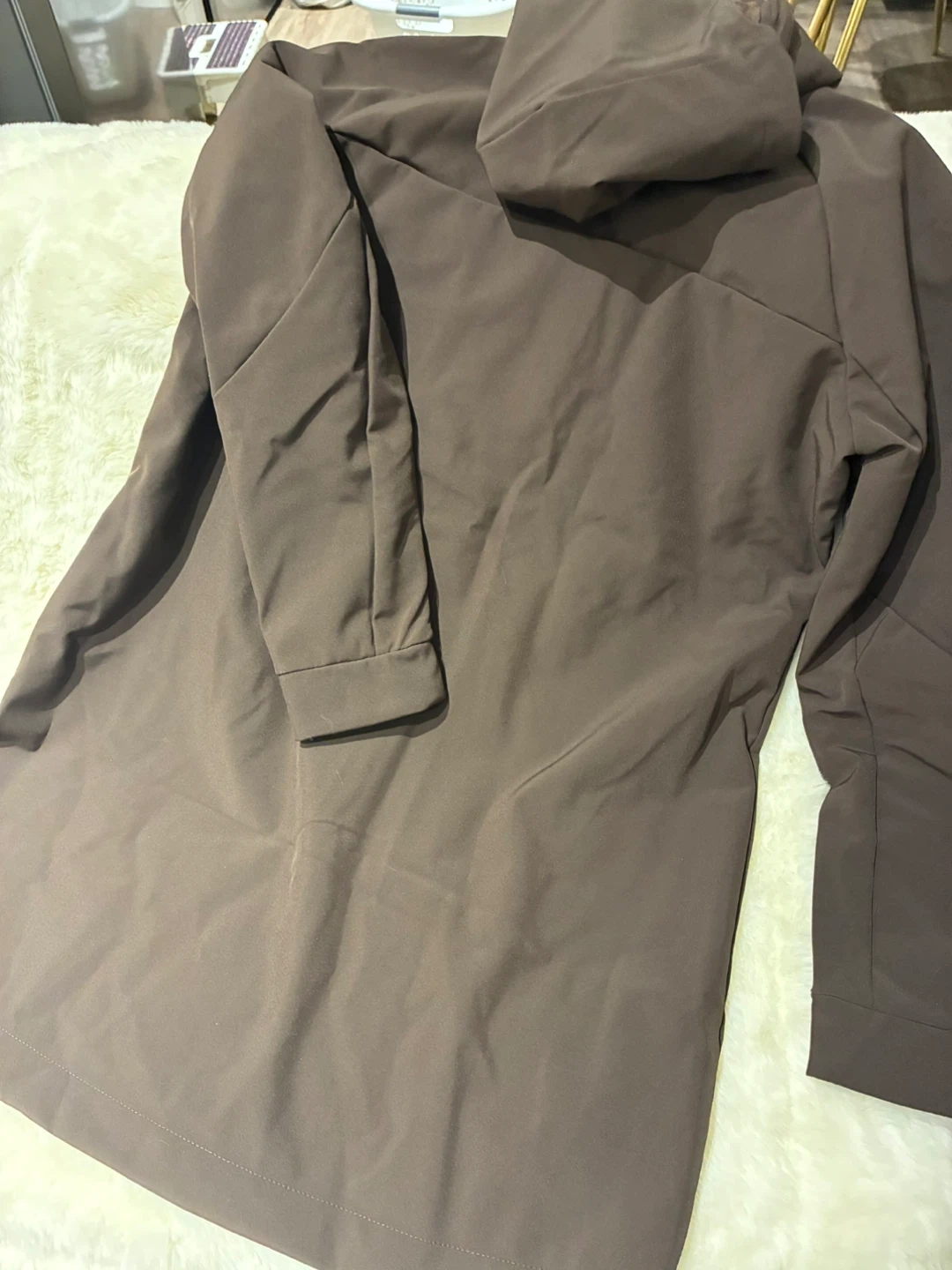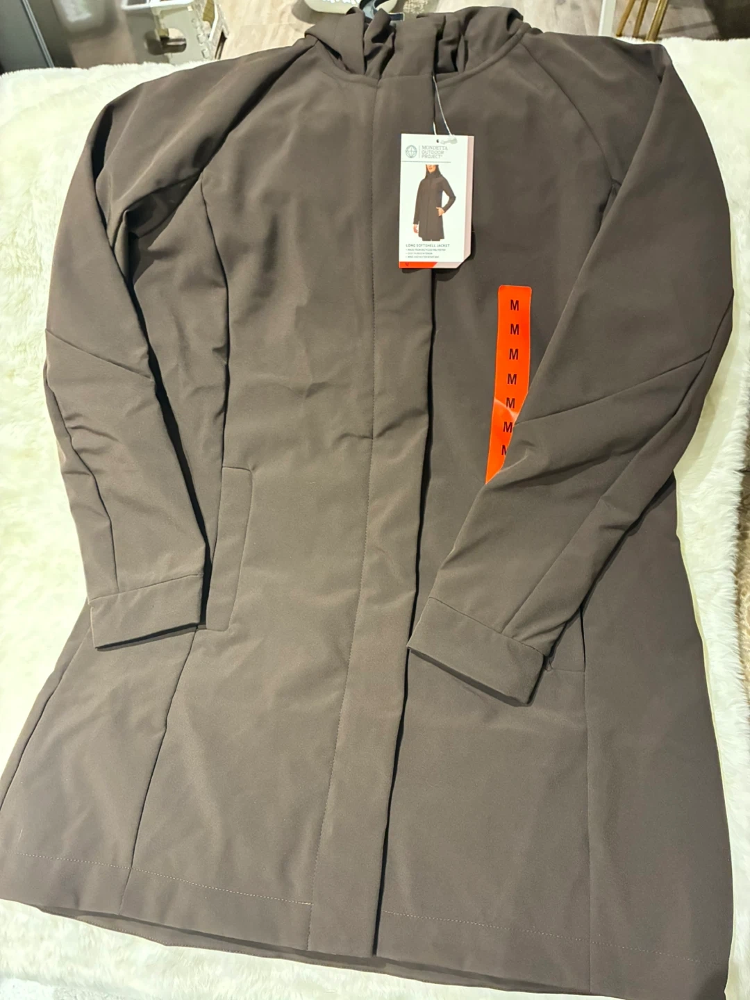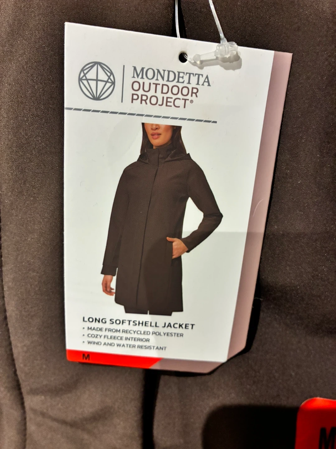 This Mondetta Outdoor Project jacket is a long softshell in brown. It's made from 70% GRS recycled polyester with a cozy fleece interior. It's wind and water resistant. This jacket is a size medium.