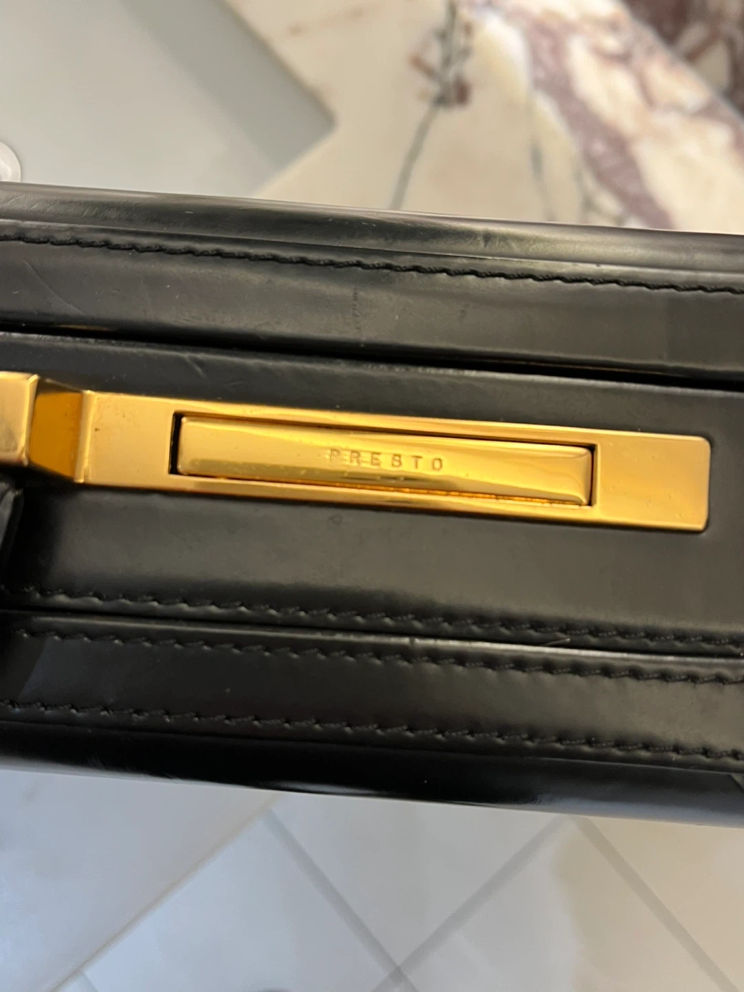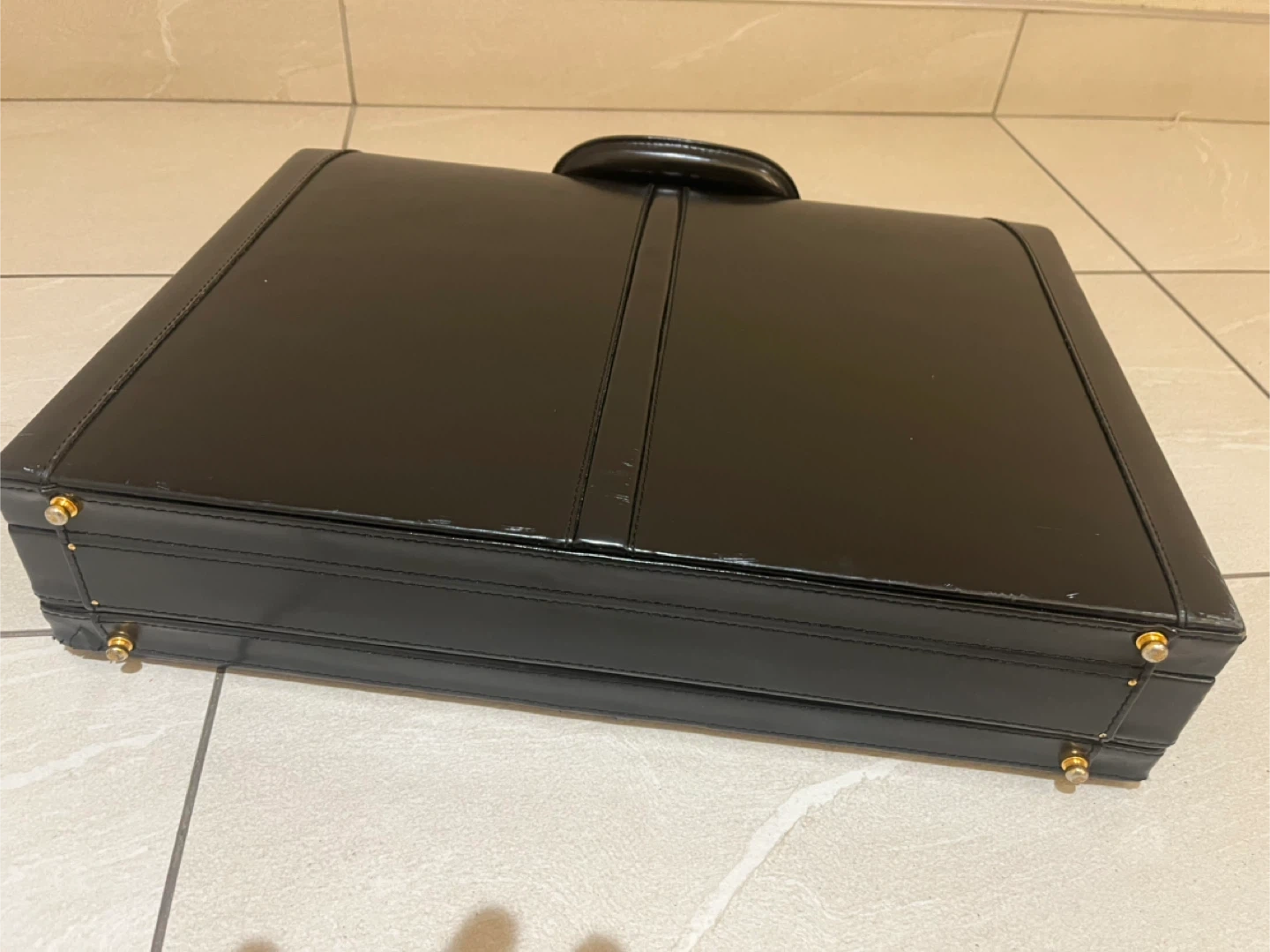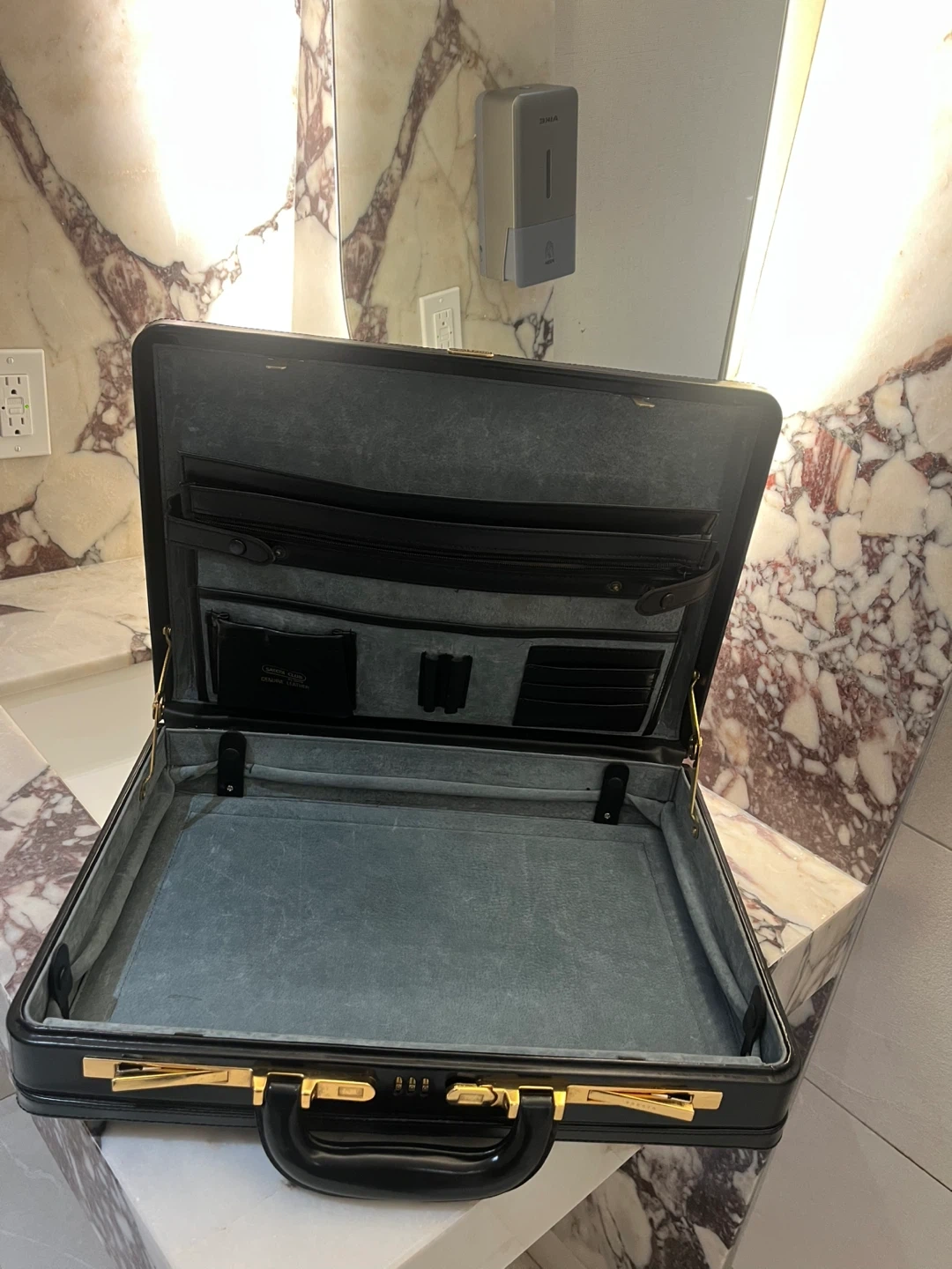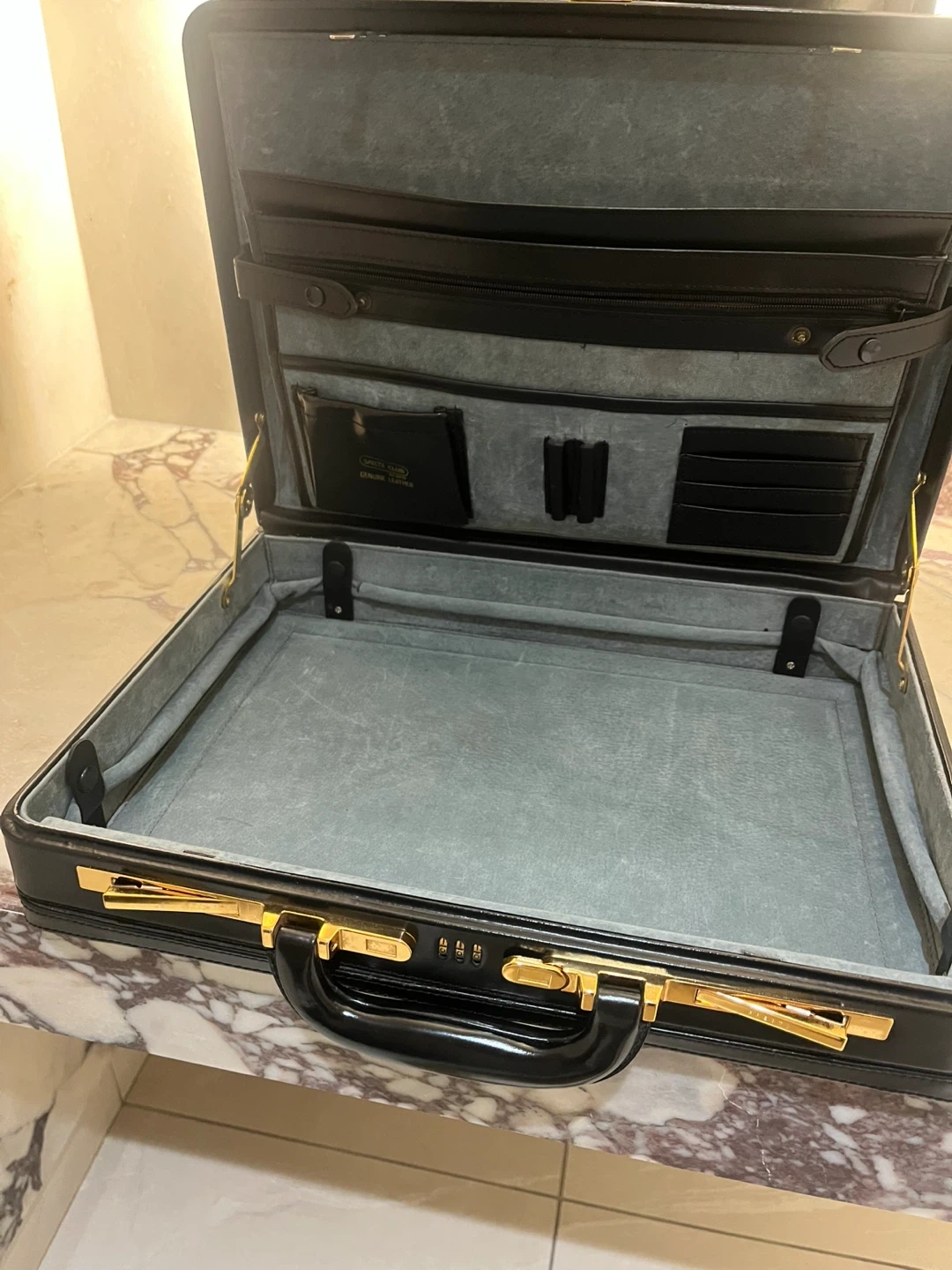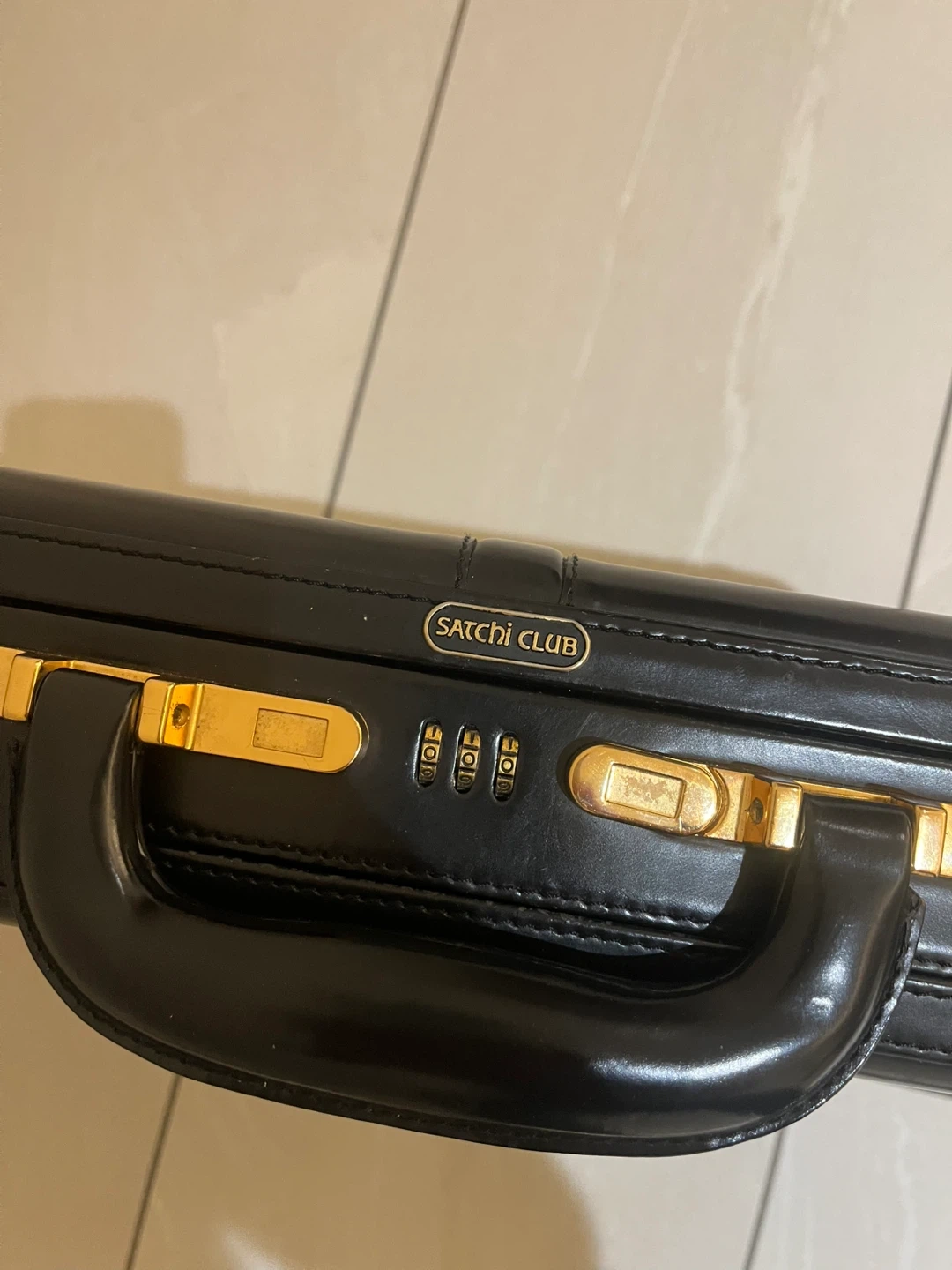 Classic black leather briefcase from Satchi Club. Features a three-digit combination lock and gold-tone hardware. Interior has multiple compartments for organization. It's perfect for professionals needing to carry documents and a laptop.