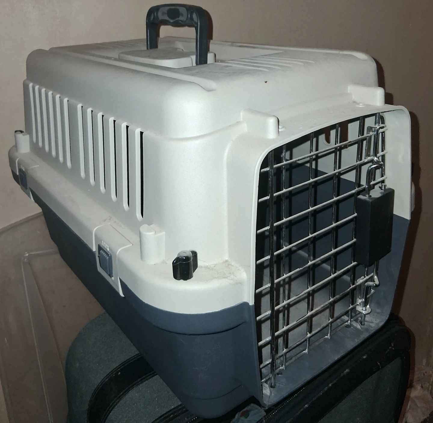 This is a standard plastic pet carrier with a metal door. It's a neutral grey and white colour. The dimensions are suitable for smaller pets. It's great for trips to the vet or travel! Pickup Only unless near intersection of Oxford and Gammage Street.