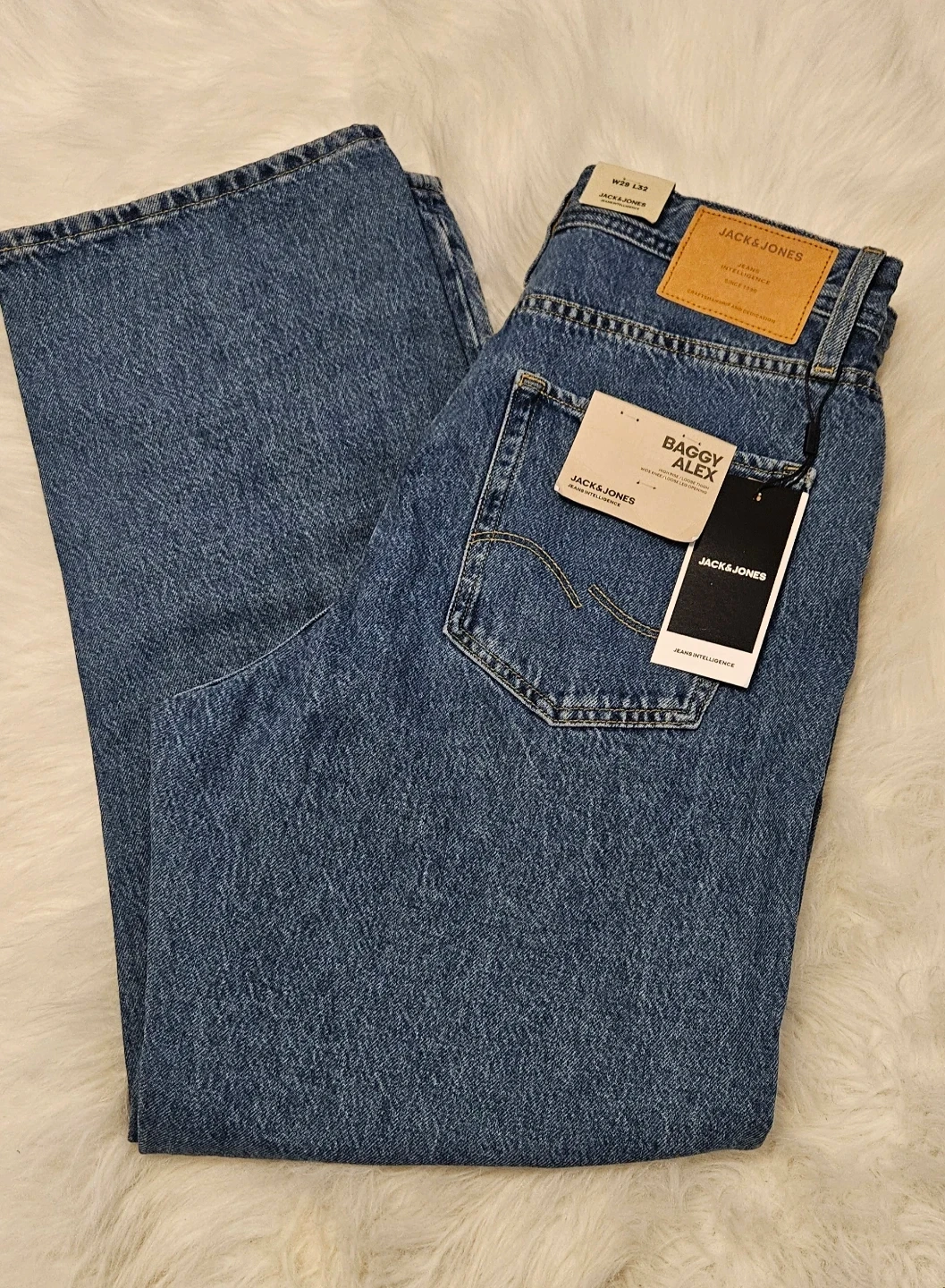 These are JACK & JONES Baggy Alex jeans in a medium blue wash. Cotton denim construction with a relaxed fit. Perfect for casual everyday wear! A high rise/loose thigh wide knee/loose leg opening.