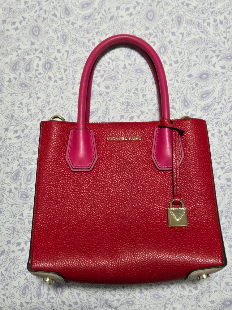 Pre-owned Michael Kors Mercer Gallery satchel. Red pebbled leather. Pink accents. Gold-tone hardware. Removable shoulder strap. Small size, ideal for everyday use.