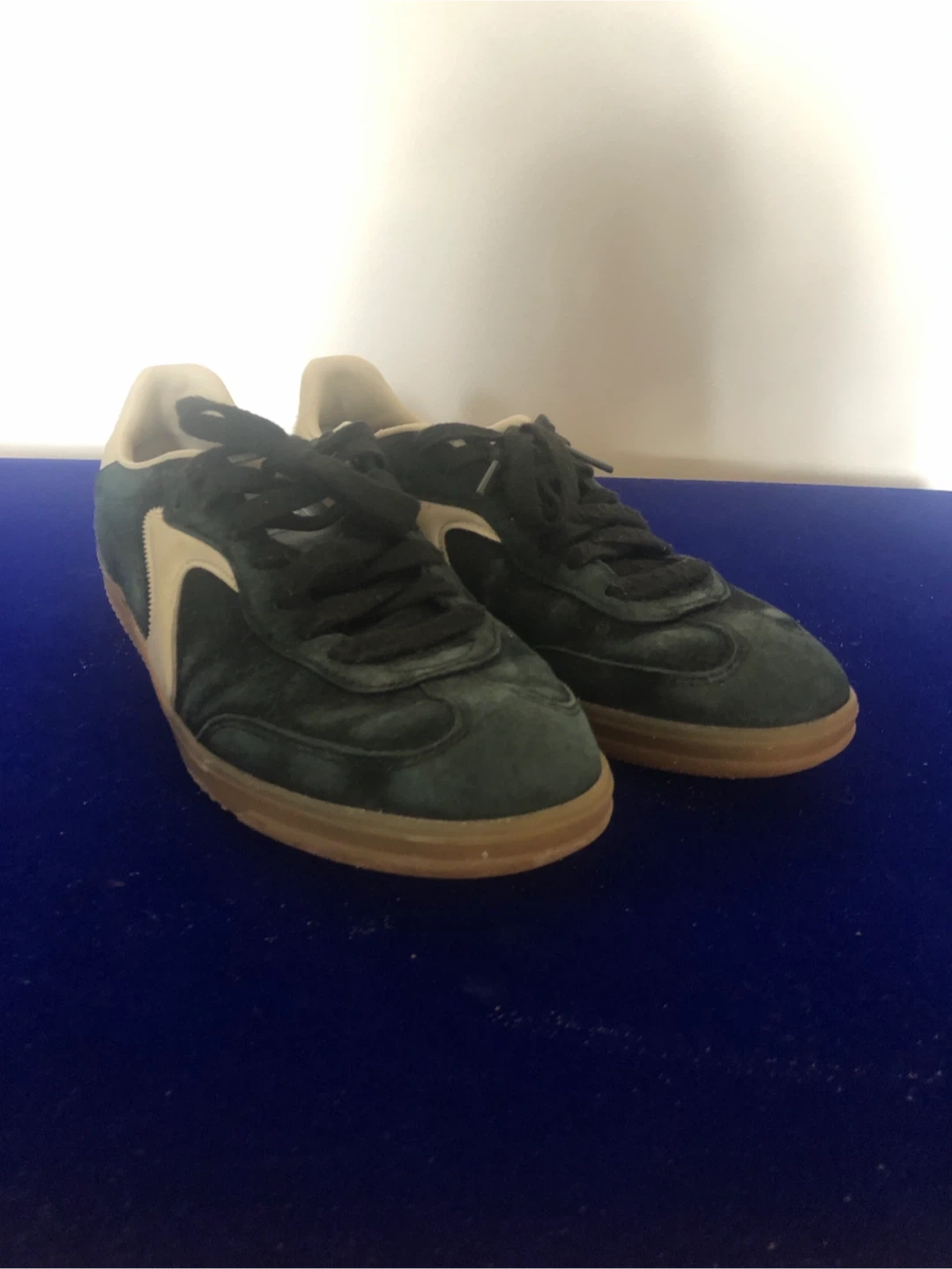 A pair of Skechers men's casual sneakers in a dark green and cream colour. These shoes feature a suede-like upper and a gum sole. They're great for everyday wear.