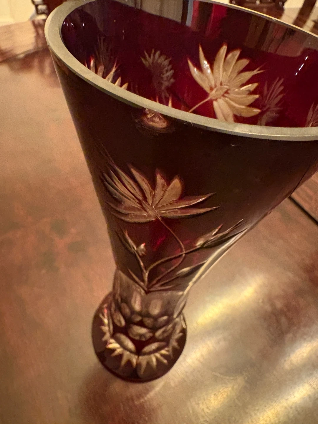 Beautiful deep red crystal vase with intricate etched floral designs. It's a real statement piece for any room. The base features a classic hobnail pattern and cut details.